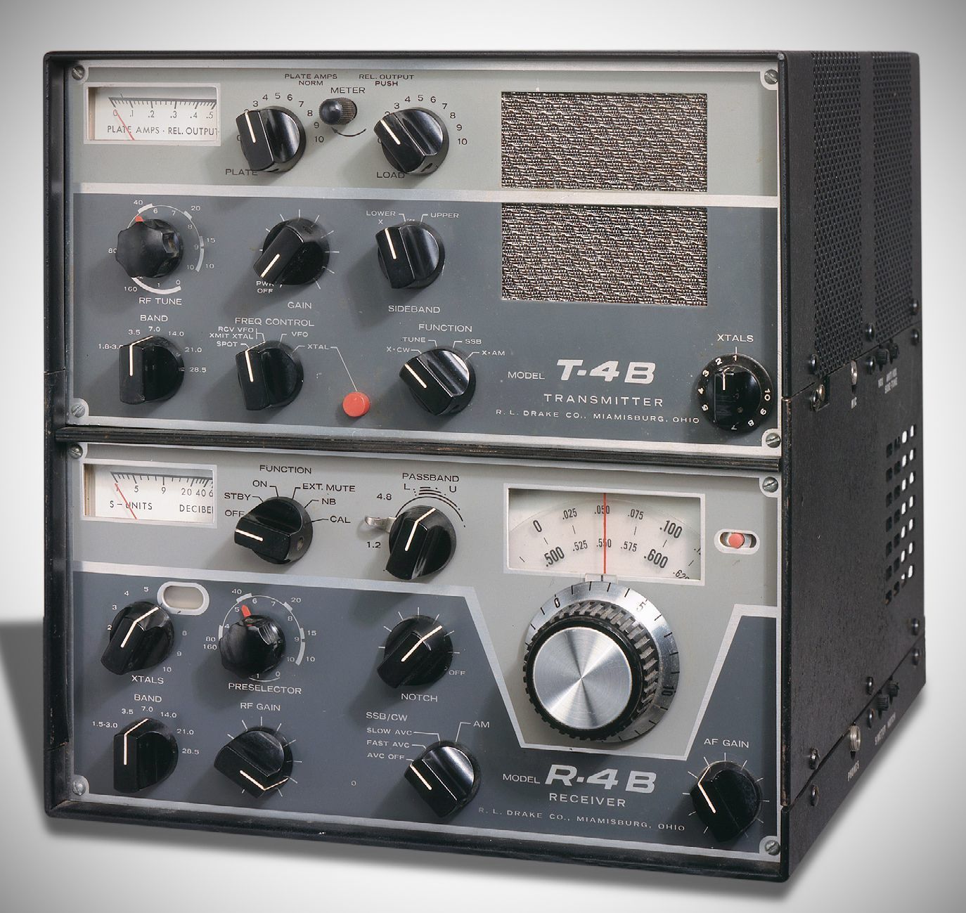 The TR-44B communications station combined a T-4B transmitter, an R-4B receiver, and speaker in the same cabinet. It could operate as a tunable receiver/crystal-controlled transmitter, or as a full transceiver using the receiver PTO. The 120 watt output station was used by government and commercial services as well as amateur radio operators.