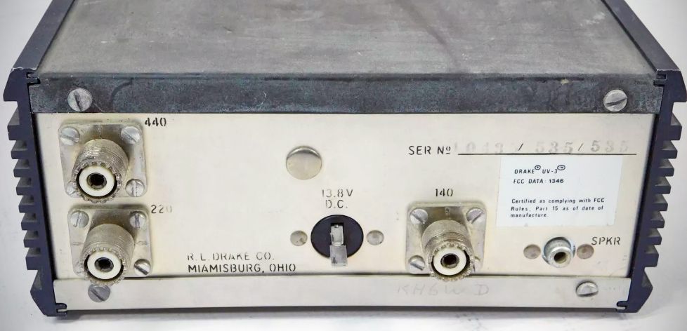 Until1 977, the R.L. Drake company had been importing its VHF FM gear. The UV-3 changed that. It was made in Drake's Ohio plant and changed some other things as well. The synthesized UV-3 was primarily a 2 meter transceiver but could also operate on both 220 and 440 MHz by adding circuit boards for each of those bands. It could be configured as a full-blown three-band rig, or only 220 or 440 could be added to the basic two meter setup. Standard repeater offsets (600 kHz, 1.6, and 5 MHz) were included. FCC Part 15 rules made it necessary for the owner to return the rig to Drake for the installation of additional bands. Output in the high-power position was 35, 15, and 8 watts on the 144, 220, and 440 MHz bands, respectively; $1130.00 (for the full 3-band package).