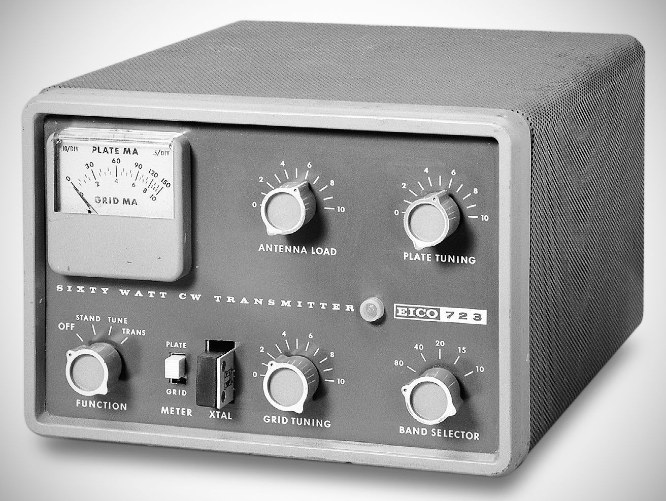 Eico introduced the 723 in 1960. The units uses a 6CL6 electron-coupled Colpitts oscillator low crystal heating and minimum effect of plate loading on frequency. The power supply is a choke input, full wave type providing 500 volts. The pi-network output consists of a tapped coil, with plate tuning and antenna loading air variables. Another air variable tunes the grid tank of the final (and the plate tank of the oscillator). The meter can read both grid and plate current. A rear panel load switch inserts extra capacitance for low impedance loads on 80 and 40 meters, and an octal socket provides connections for a modulator, antenna relay, VFO power take-off, and emergency power input.