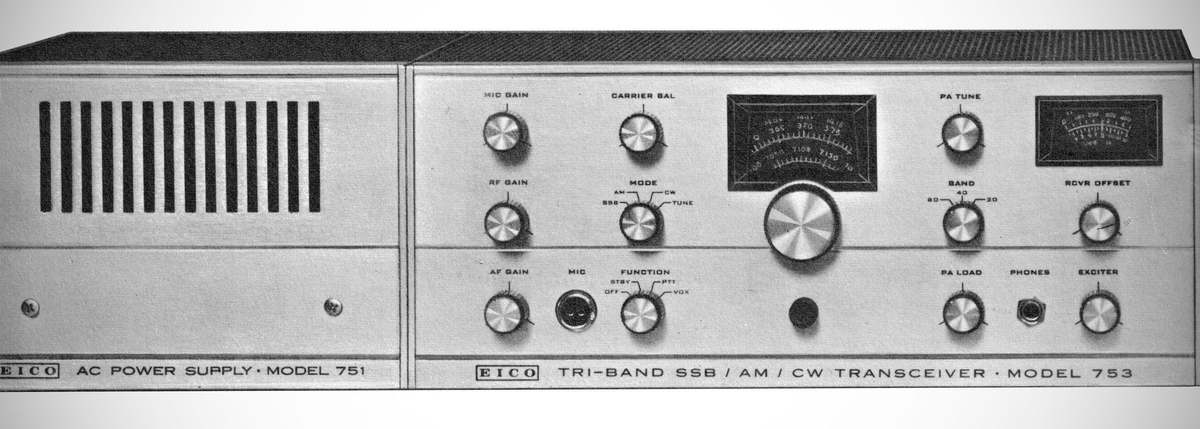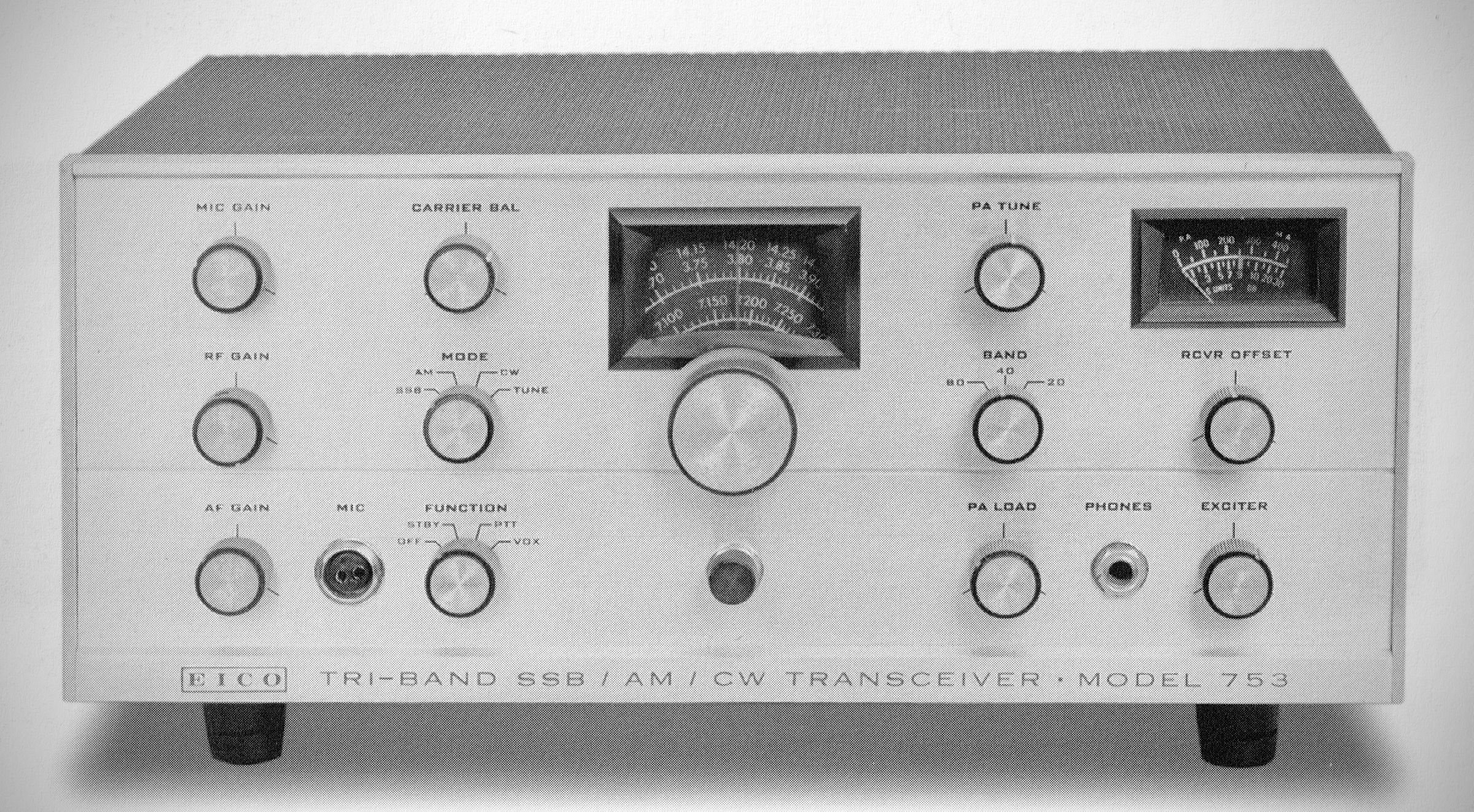 The EICO 753 is a vintage tri-band amateur radio transceiver introduced in 1965. It covers the 80, 40, and 20 meter bands and supports SSB, AM and CW modes.