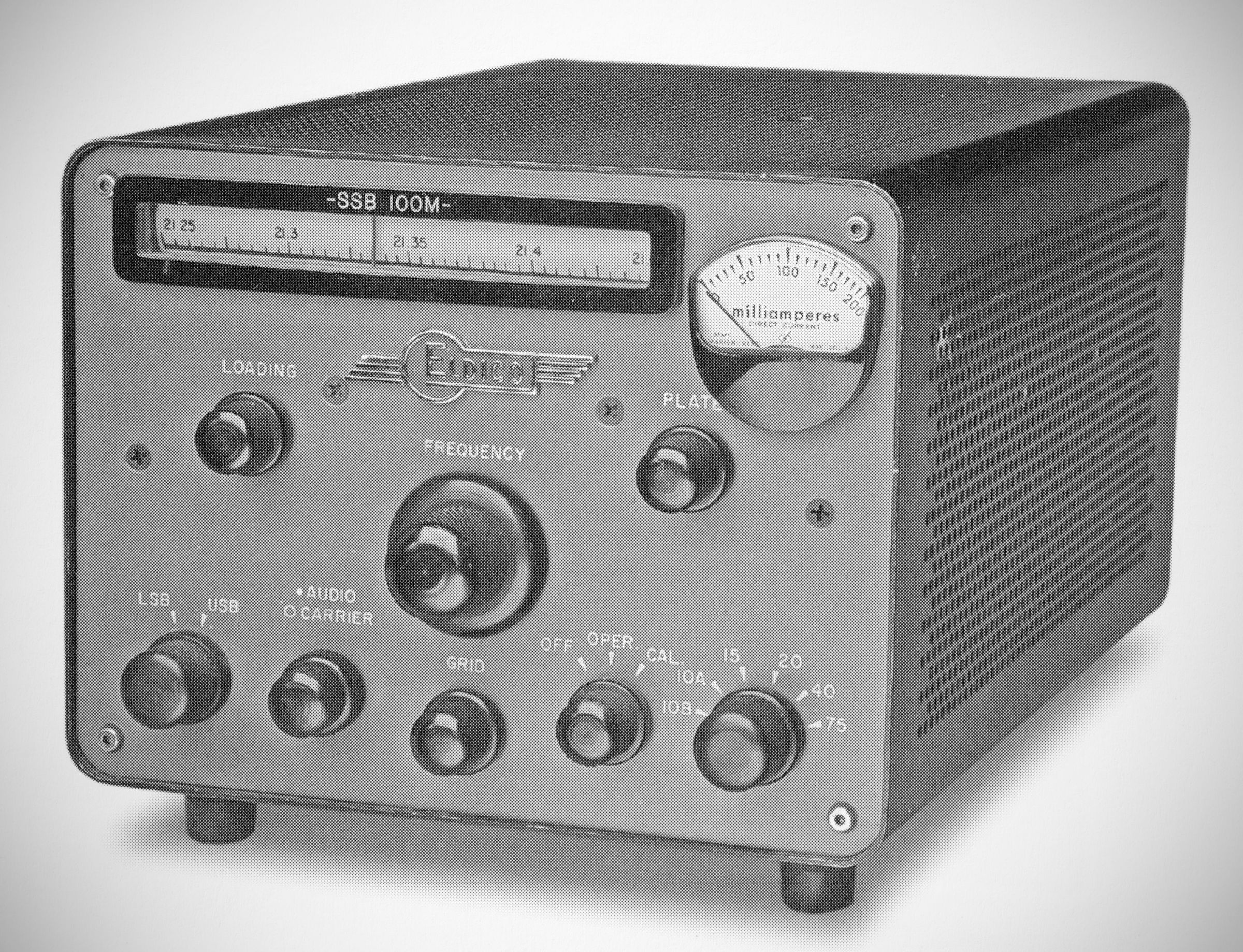Eldico's 100 watt mobile sideband transmitter used a crystal lattice filter for sideband generation. Its VFO tuned 200 kHz portions of the 80-10 meter phone bands. The SSB-1OOM used 10 tubes, with a 5894 as the final amplifier.