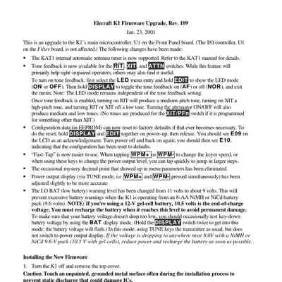 The unit consists of five chassis pieces and three primary printed circuit boards: Front Panel, Filter, and RF board.It nncludes instant band selection, RIT/XIT (receive and transmit incremental tuning), a digital LCD, and a configuration menu. Integrated features such as a frequency counter, wattmeter, and battery voltage monitor aid in setup and troubleshooting.