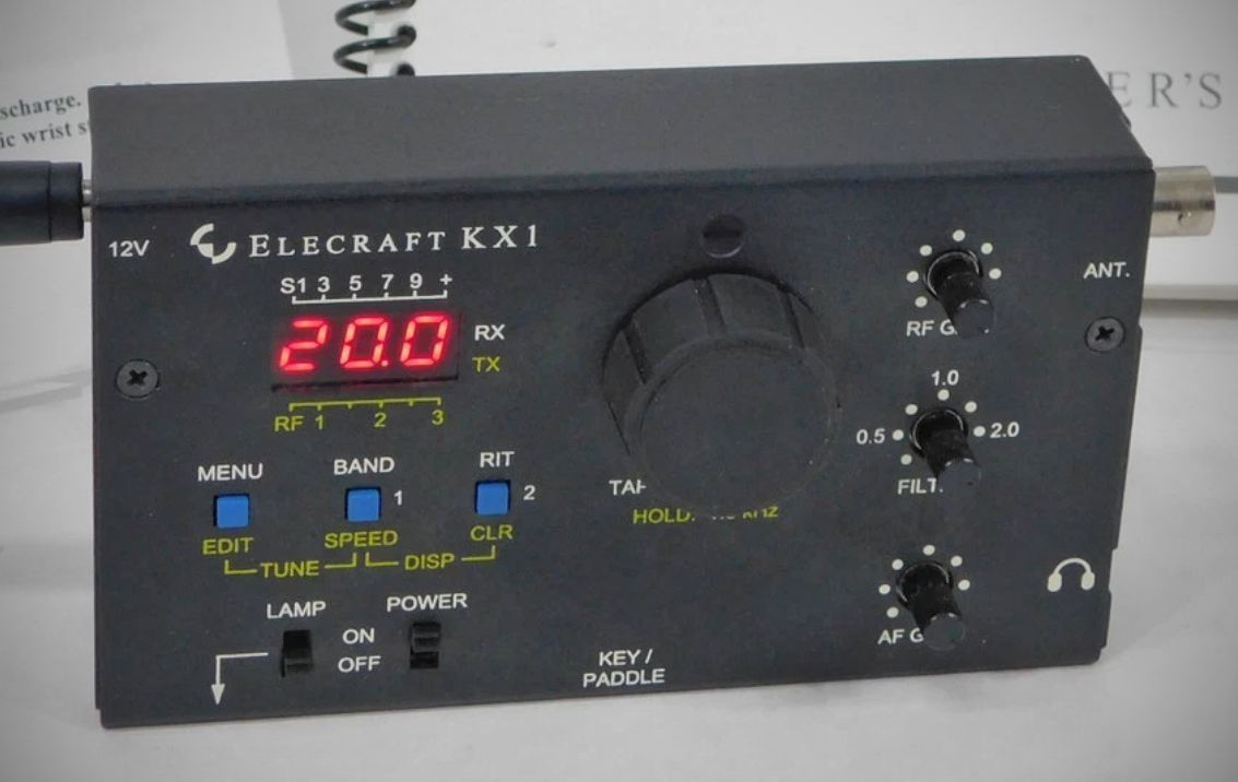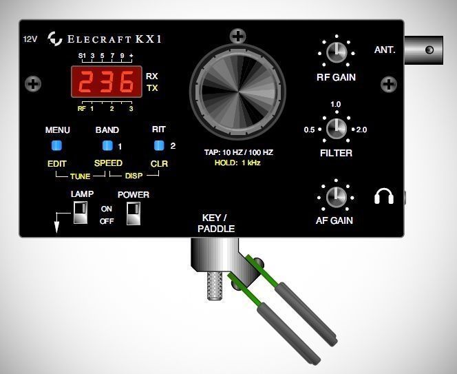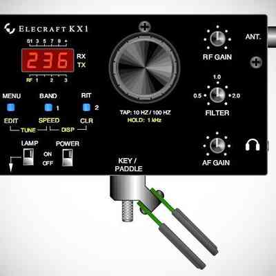 The Elecraft KX1 is an ultra-portable, multi-band CW transceiver specifically optimized for backpacking, travel, and "trail-friendly" operation. Its unique design features controls on the top of the cabinet and a front-attaching keyer paddle, making it ideal for handheld use or operating from a lap while sitting on the ground or in a camp chair. The unit is highly integrated, accommodating an internal battery, optional automatic antenna tuner, and a log-book lamp in a compact package.