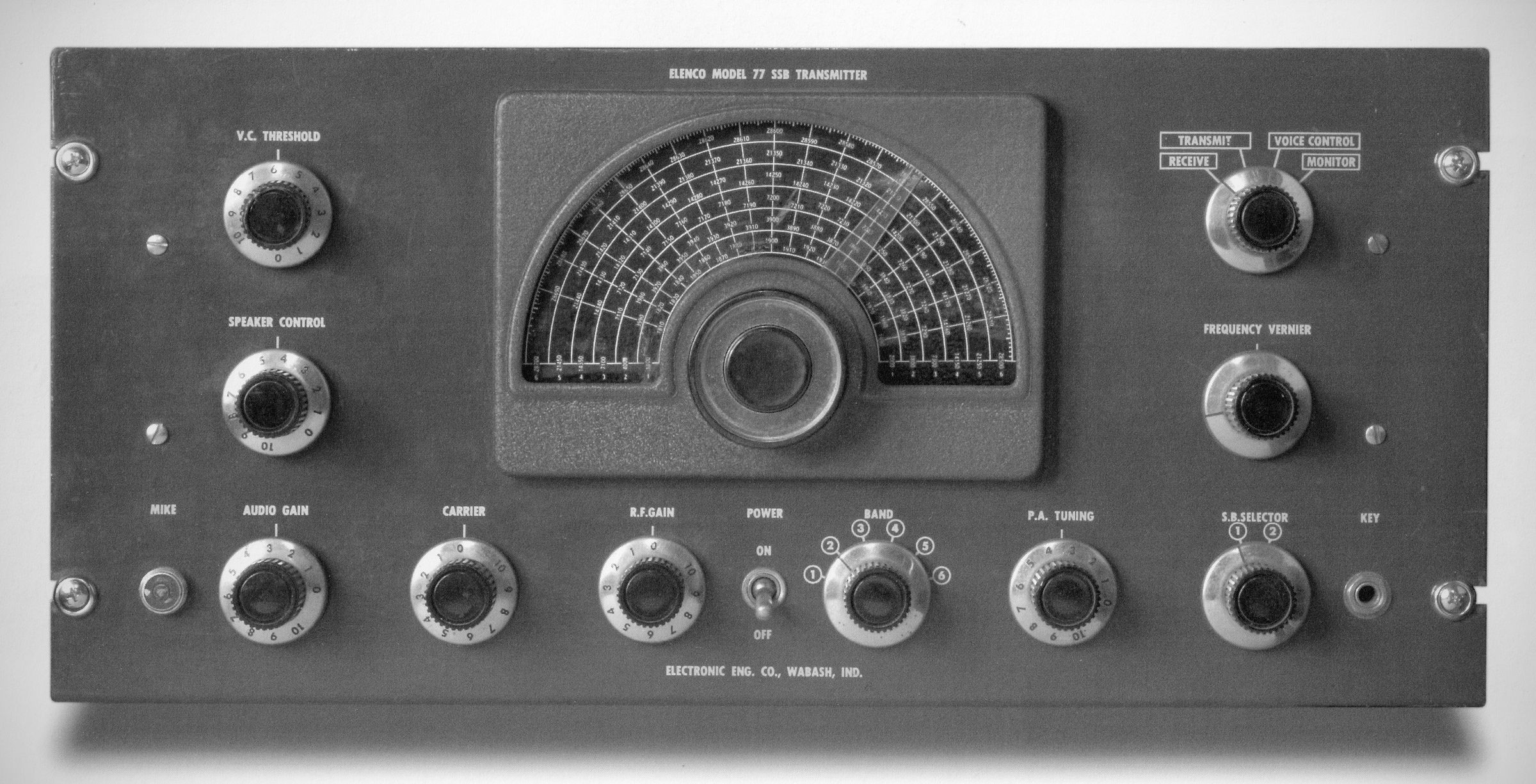 The Elenco 77 was a 160–10 meter band-switching SSB transmitter. It had built-in VFO and VOX circuits. A crystal lattice filter was used in the sideband generator. PEP output was 100 watts. The Elenco 77 also transmitted AM and CW. The VFO covered a 200 kHz segment of each band. Full coverage of 10 meters was obtained with separate mixer crystals.