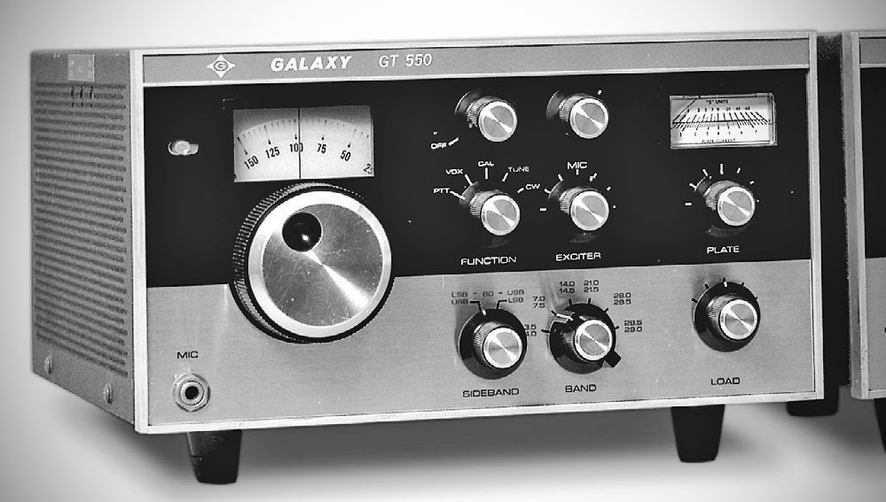 The GT-550 was a redesign and repackaging of the Galaxy V Mk III transceiver. It made greater use of sold-state devices than its predecessor. SSB PEP input increased to 550 watt. Requires the AC-400 AC power supply or the G-1000 DC power supply.