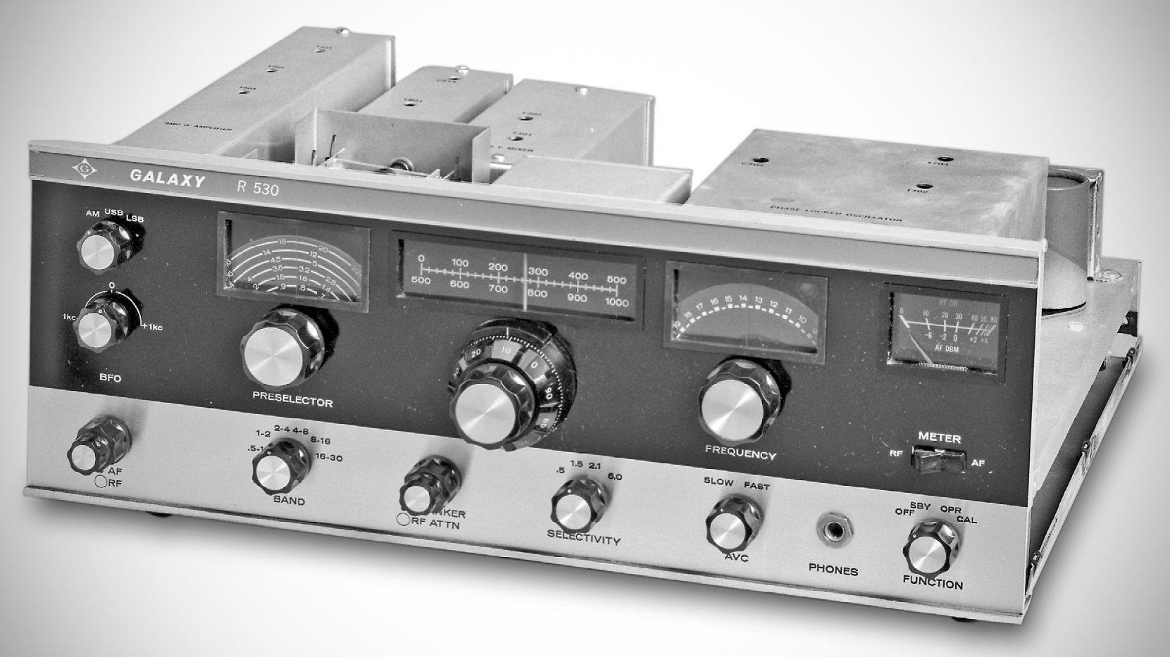 The R-530 communications receiver from Galaxy Electronics was solid-state and synthesized. It used modular construction, some of which can be seen in this “topless” photo. The R-530 covered .5–30 MHz in 500 kHz ranges and had 1 kHz calibration on its tuning dial. The standard 9 MHz IF filter was 2.1 kHz, with .5, 1.5, and 5 kHz filters available as options.