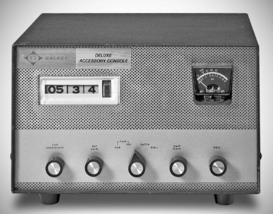 The Deluxe Accessory Console for the Galaxy III and V transceivers contained an SWR meter, a phone patch, a speaker, and a digital clock.