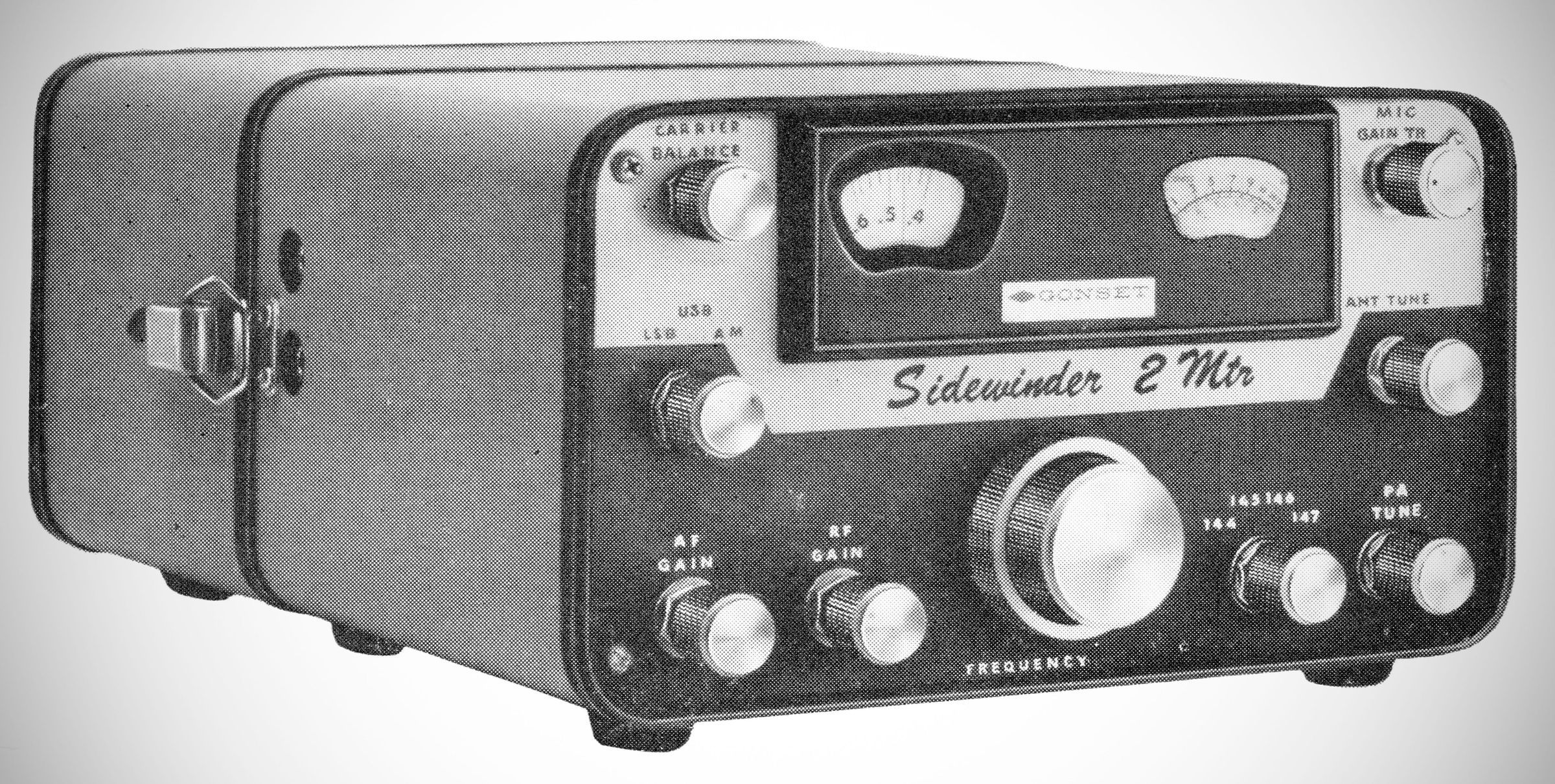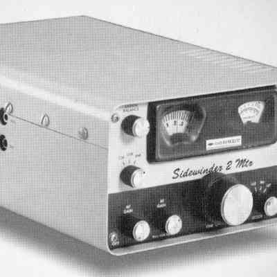 The Gonset Sidewinder SSB, CW, and AM transceiver covered the 2 meter band in four 1 MHz segments. The receiver was completely transistorized. Input power was 20 watts on CW and SSB, 6 watts on AM. The accessory power supply snapped on the back of the transceiver or could be mounted remotely.