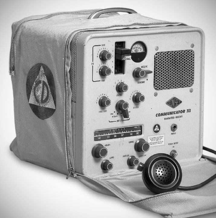 The CD Communicators were approved by the Federal Civil Defense Administration. They were painted yellow and came in a canvas carrying case. A dynamic hand microphone was standard equipment.