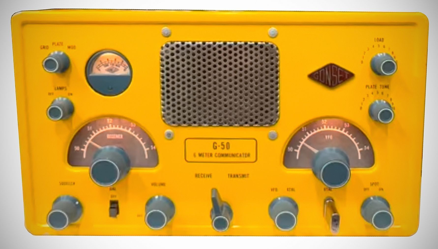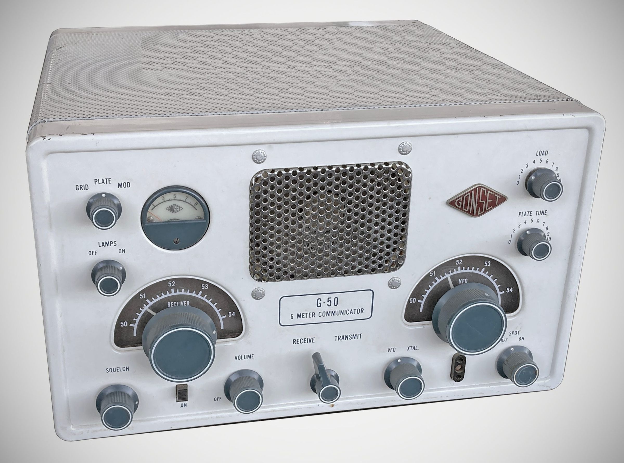 The Gonset G-50 was a complete 50 watt, 6 meter AM station. The transmitter was VFO controlled and both it and the receiver tuned 50-54 MHz. The final amplifier was a 6146. The G-50's 115 VAC supply was built-in.