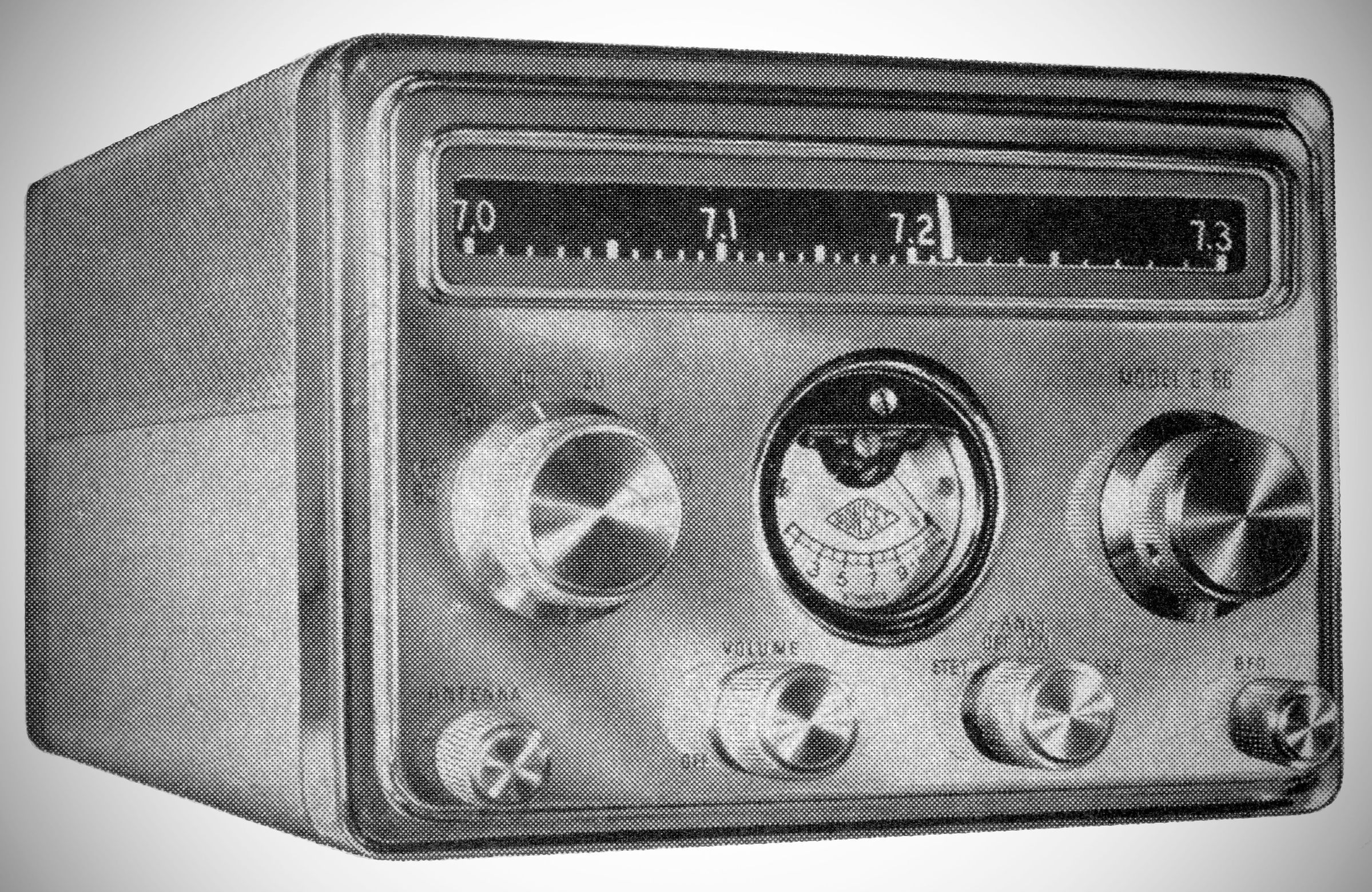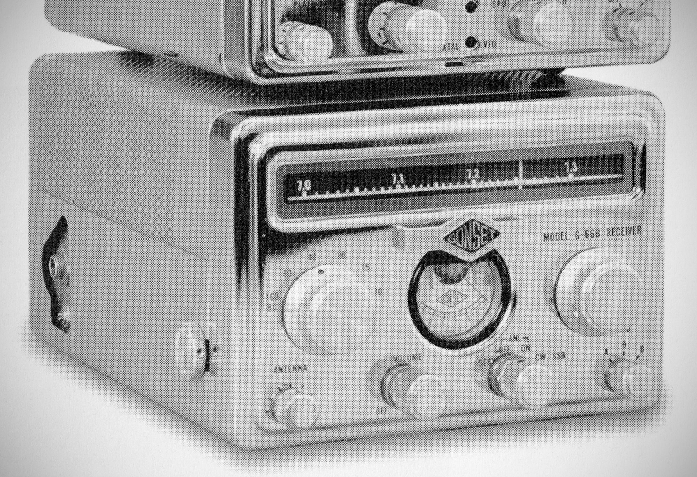 Gonset's chrome-plated G-66(B) receiver was designed to be paired with the company's G-77 transmitter. It covered the broadcast band plus 80-10 meters in six bands. The double-conversion set's first IF was at 2050 kHz. Selectivity came from eight UC circuits in the 262kHz second IF.