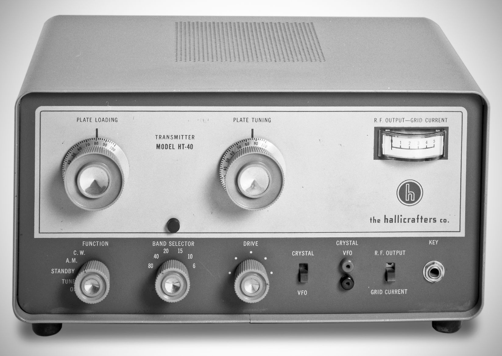 The HT-40 transmitter and its companion receiver, the SX-140, were available both as “Halli-Kits” and wired and tested. The crystal-controlled, 75 watt rig featured band-switching coverage of 80–6 meters and worked AM phone as well as CW. The final amplifier was a 6DQ5.