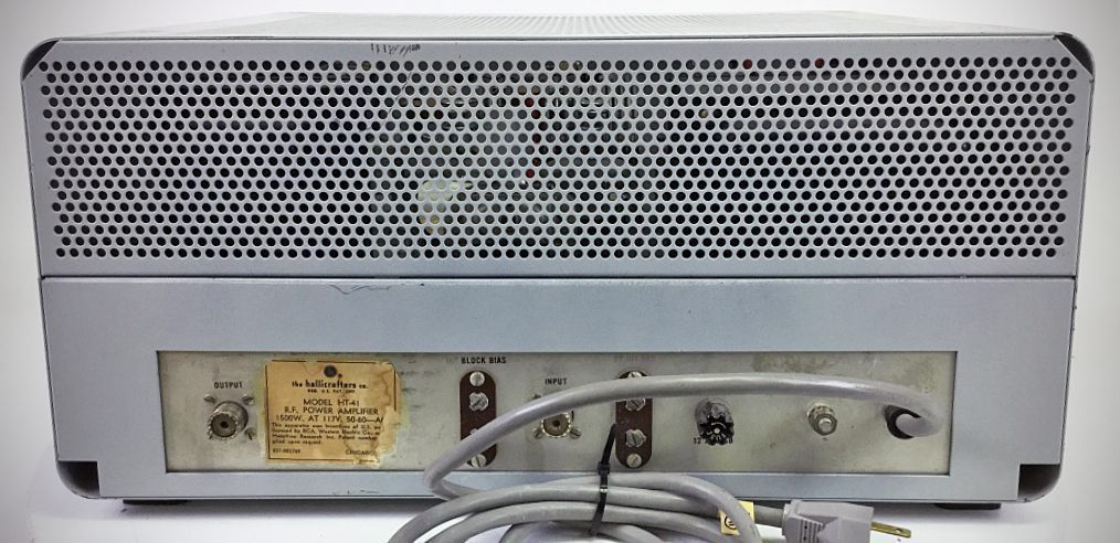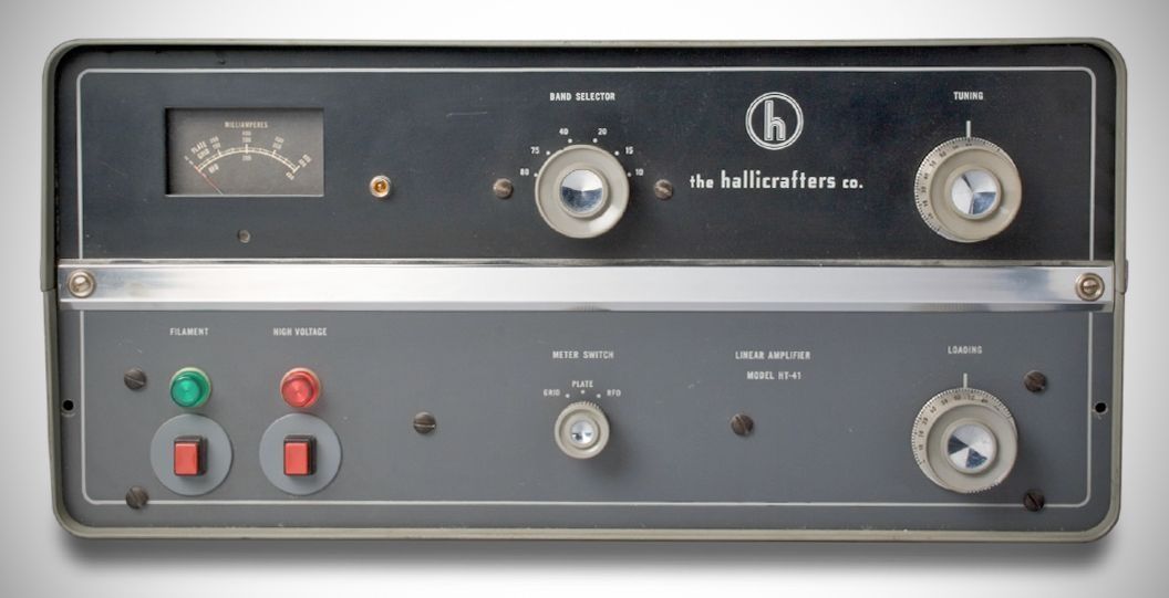 The HT-41 linear amplifiercould be used with exciters having 20–100 watts output, although it took at least 60 watts to drive the amp to full power. Input power was rated at 1200 watts PEP on SSB, 700 watts on CW, and 350 watts on AM. The HT-41 used a pair of 7094 tubes in Class B grounded-grid. It was styled to match Hallicrafters’ HT-37 transmitter. The plate and filament switches on the amplifier pictured are not original.
