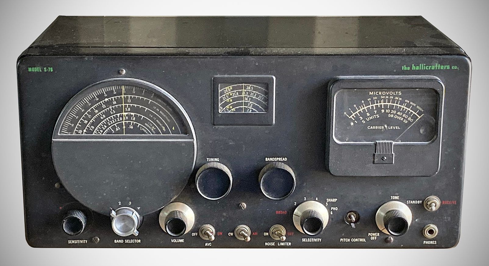 The S-76 was double conversion with IFs at 1650 and 50 kHz. It is difficult to miss the 11-tube set's giant 4-inch S-meter. Frequency coverage was 538-1580 kHz and 1720 kHz-32 MHz. Selectivity was provided by UC circuits in the second IF. One RF, two conversion, and two IF stages. Audio output is 2.5 watts, "peaked for communications frequencies." Separate main and band spread tuning controls, with BFO pitch, "full range" tone control, and a large 4.5" S-meter. Includes a phono input jack with front panel selector. Selectivity in five steps, see diagram. Early versions did not include 15 meters on the band spread scale. Also includes a 500 Ω line out jack. Requires at external 3.2 Ω speaker.