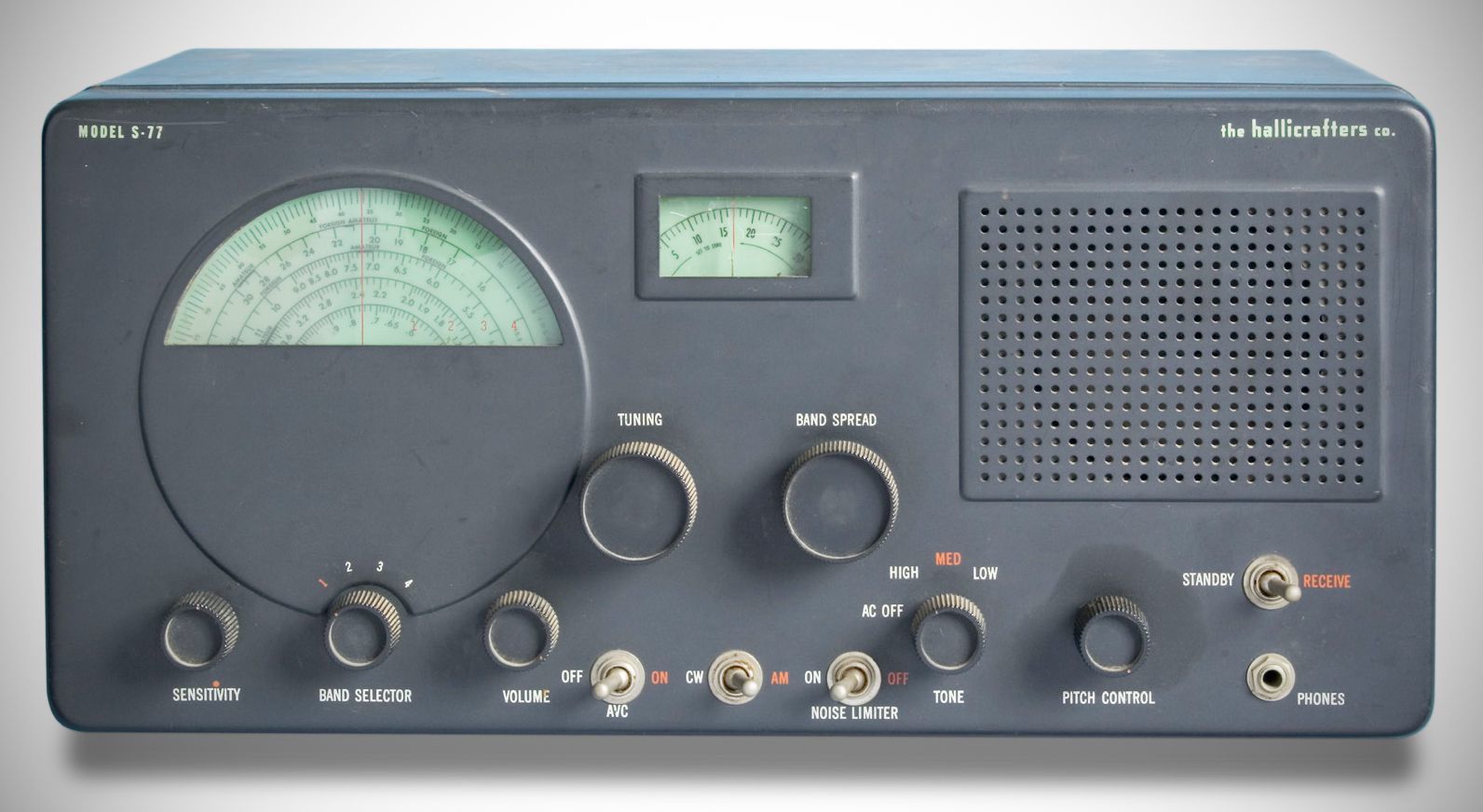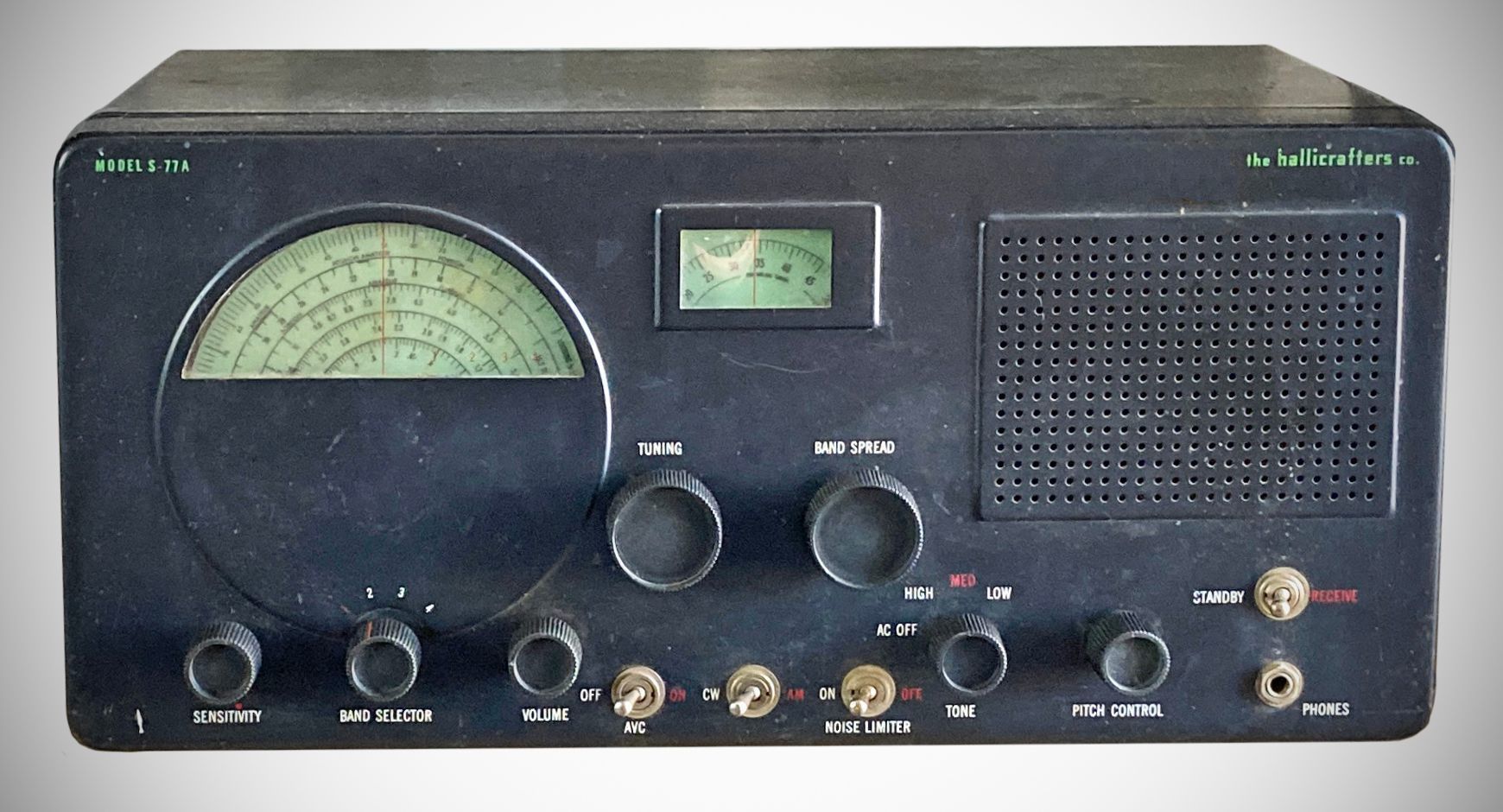 Features include a headphone jack, BFO, ANL, AVC, pitch, mute, built-in speaker, three position tone control, and sensitivity control, and a zero to 100 bandspread.