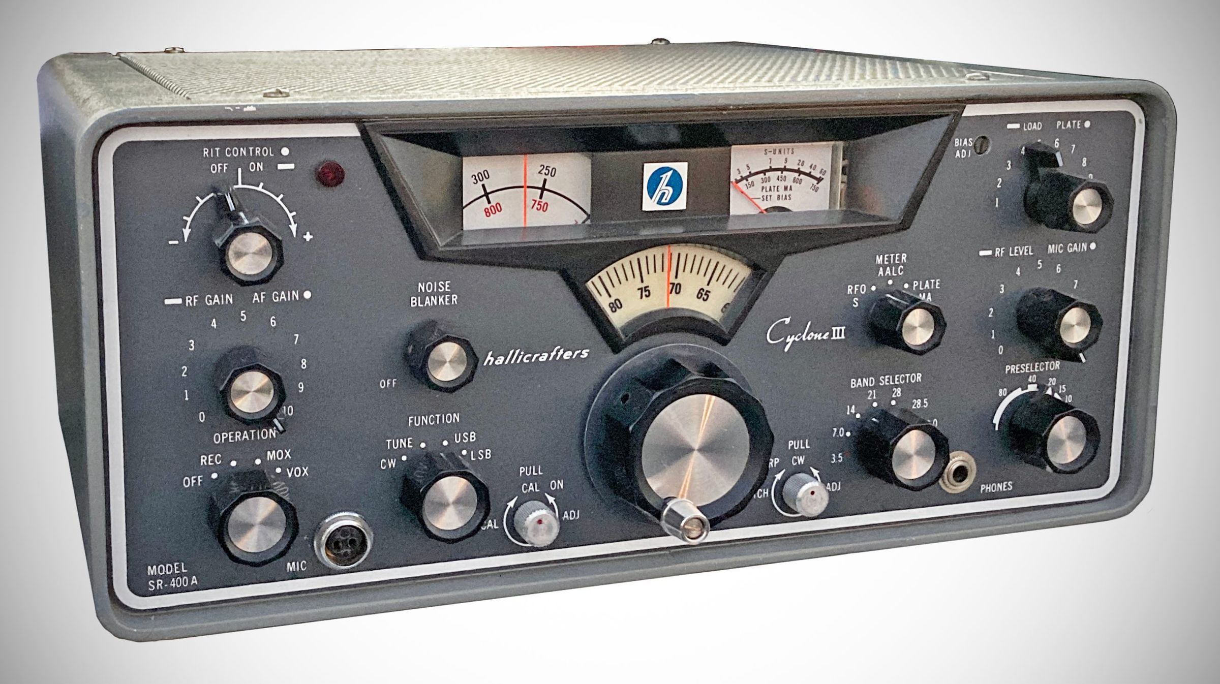 The SR-400A “Cyclone III” transceiver offered improvements over the SR-400 in the form of increased power and a factory-installed cooling fan. Input power to the 6DK6 finals was 550 watts on SSB and 350 watts on CW. The transceiver covered 80–10 meters and required an external power supply, PS-500A.