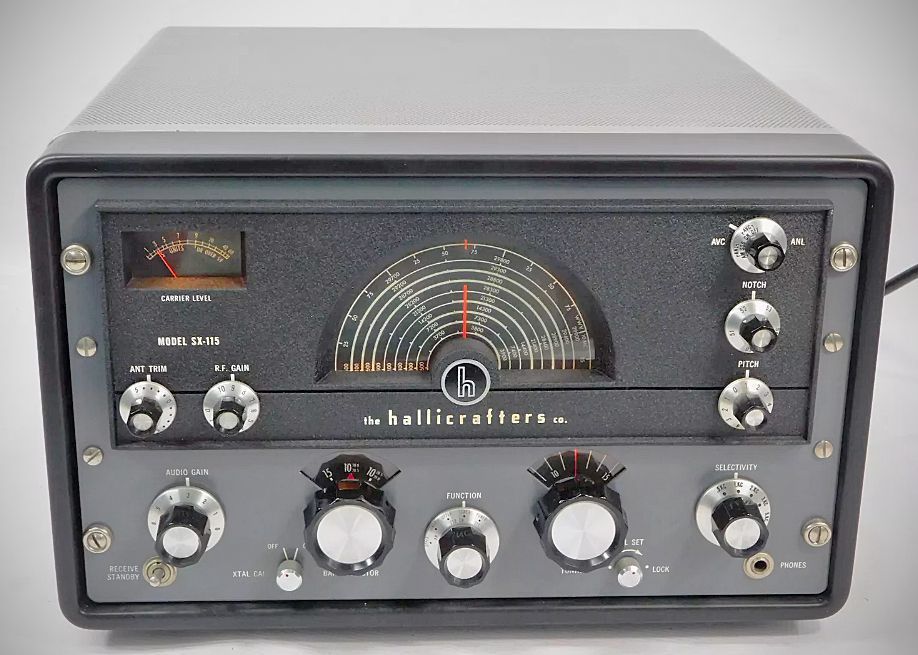 The SX-115 covered 80-10 meters in nine 500 kHz bands. The 18-tube receiver was triple-conversion with a crystal-con-trolled front end and a tunable first IF. The 50.75 kHz third IF's UC circuits provided five degrees of selectivity from 0.5 to 5 kHz. Frequency was calibrated in 1 kHz increments; $595.00, 1961. (14)
