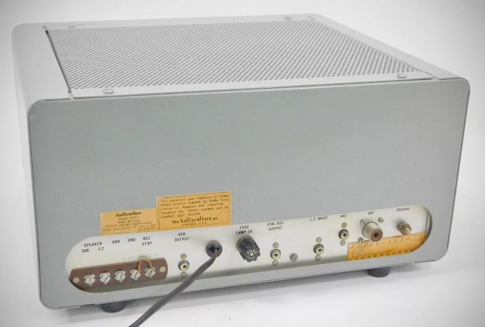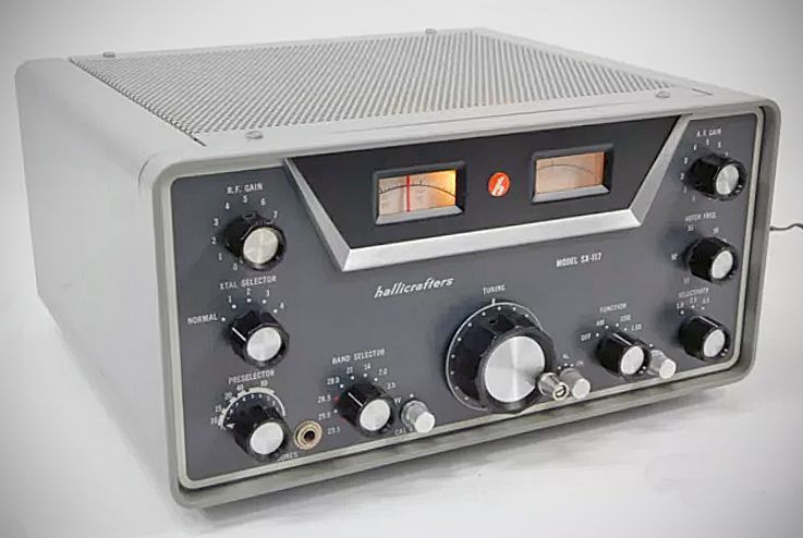 The SX-117 tuned from 3 to 30 MHz in 500 kHz bands. The triple conversion receiver was furnished with crystals for 80, 40, 20, and 15 meters, plus 28.5-29 MHz on 10 meters. Four additional band-switch positions were available to complete coverage of 10 meters or add other frequencies with optional crystals. The receiver used 13 tubes and four silicon diodes. It could transceive with Hallicrafters' HT-44 transmitter. Three selectivity settings: 5.0, 2.5, 0.5 kHz @ –6 dB.