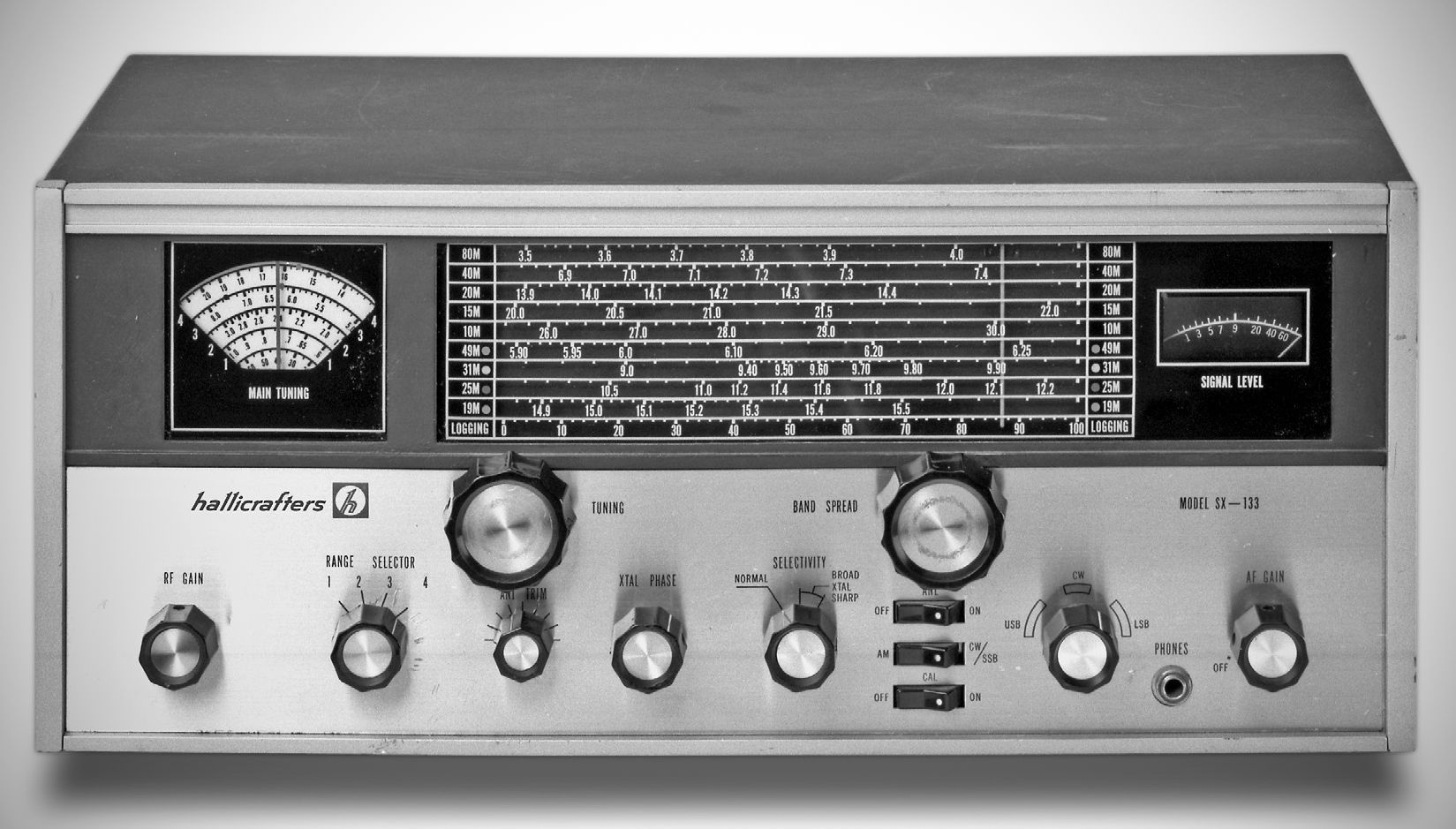 Features include a headphone jack and S-meter. bandspread (long horizontal dial), product detector, RF gain, ANL, BFO, antenna trimmer, mute terminals, crystal phasing. Requires external speaker. HA-19 crystal calibrator is optional.