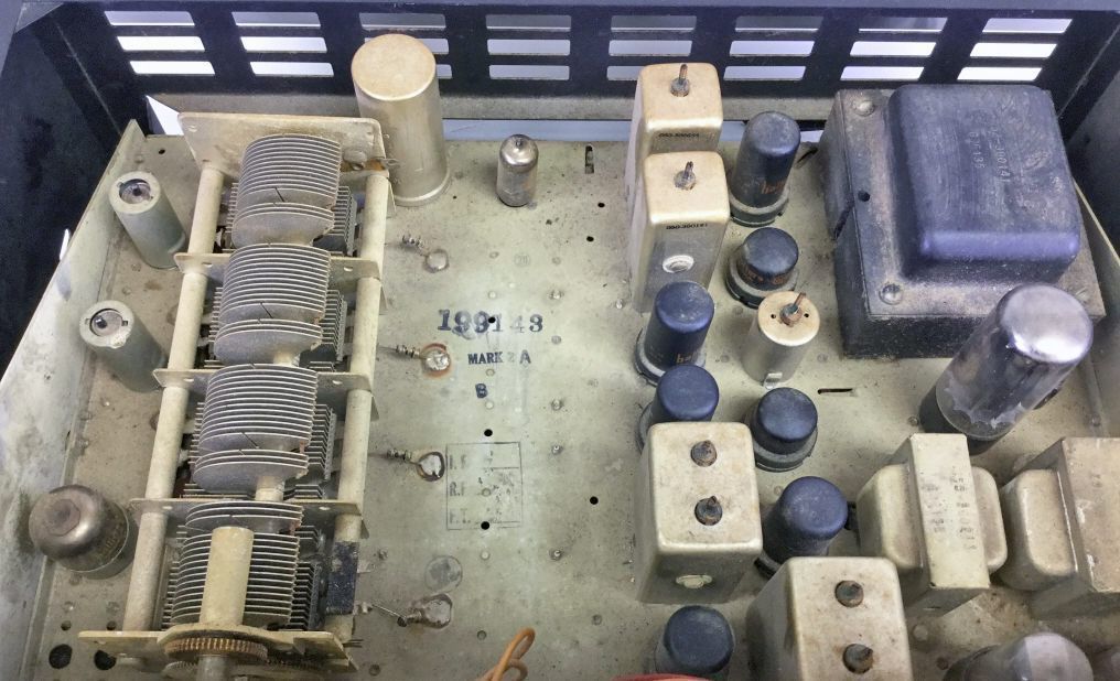 Tubes (16 total): (1) 5U4, (1) 0D3 (VR-150), (2) 6AG5, (1) 7F8, (1) 6SK7, (1) 6SG7, (2) 7H7, (2) 6H6, (1) 7A4, (1) 6SL7, (2) 6V6, (1) 6C4