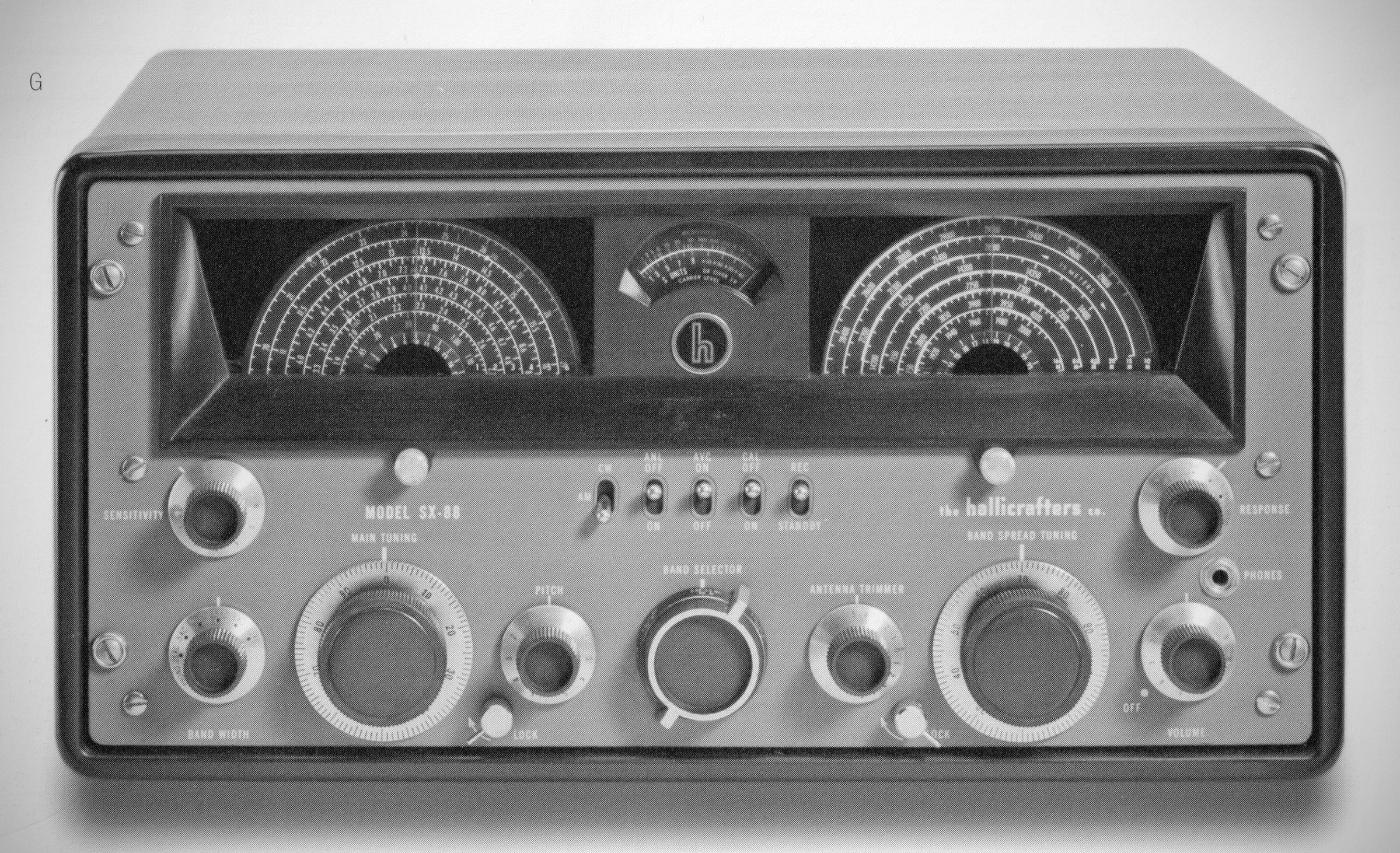 With the SX-88, Hallicrafters set out to design the "finest amateur receiver in the world." The 20-tube set covered 0.535 to 33 MHz in six bands, with precision gear-driven tuning. Band spread calibrated for 160, 80, 40, 20, 15, 11, and 10 meters. Includes a 100 kHz crystal calibrator. It was double conversion with IFs at 2075 and 50 kHz except for band two, which used 1550 and 50 kHz. L/C circuits at 50 kHz offered six steps of selectivity from 250 Hz to 10 kHz. Other features include two position BFO (one provide increased output for SSB reception), antenna trimmer, delayed action AVC, S-meter, and an IF output jack. The SX-88 had a phono input jack and 10 watts of audio from a pair of P-P 6V6s.