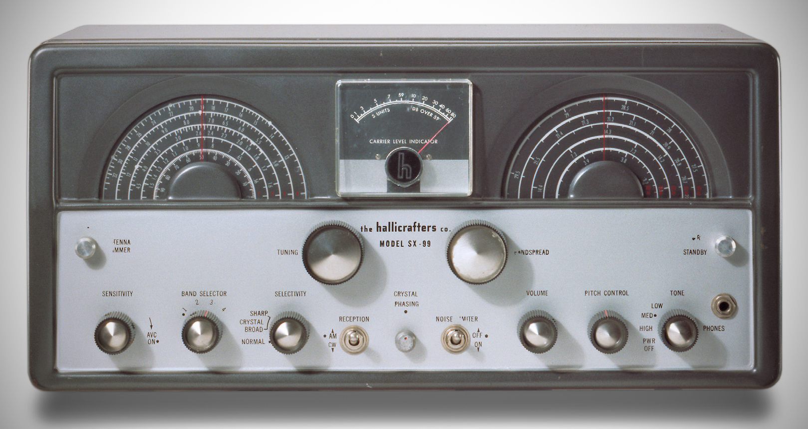 Single conversion superheterodyne circuit features bandspread calibrated for 80 40 20, 15, 11, and 10 meters, variable selectivity (broad and sharp), antenna trimmer, crystal filter, and S-meter.