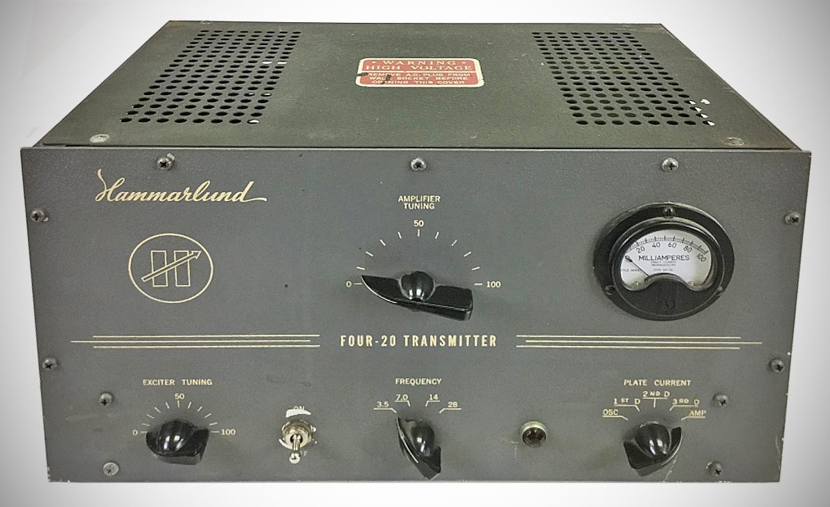 The Four-20 ran 20 watts output on CW with an 805 final and could also work AM when paired with Hammarlund's Four-11 modulator. The crystal-controlled transmitter covered 80-10 meters and used a patented feature called "Mono Sequence Tuning" to simplify changing bands.