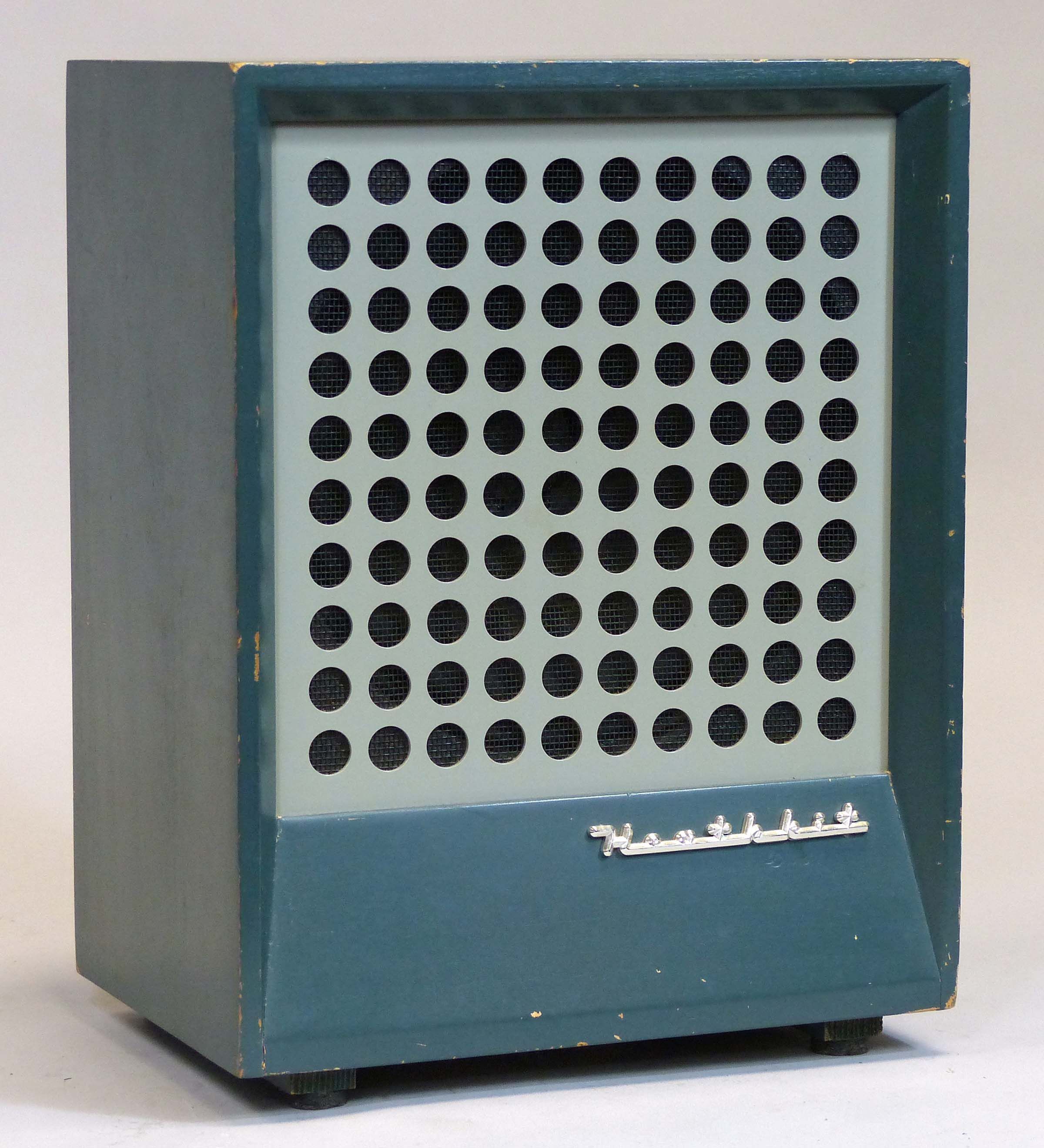 Inside is an 8-inch 8Ω speaker. The front panel is adorned with a “3D” silver plastic molded “Heathkit” script-type logo, the same as used on the RX-1, et al. The logo is an important design detail and the speaker should not be considered complete without it.