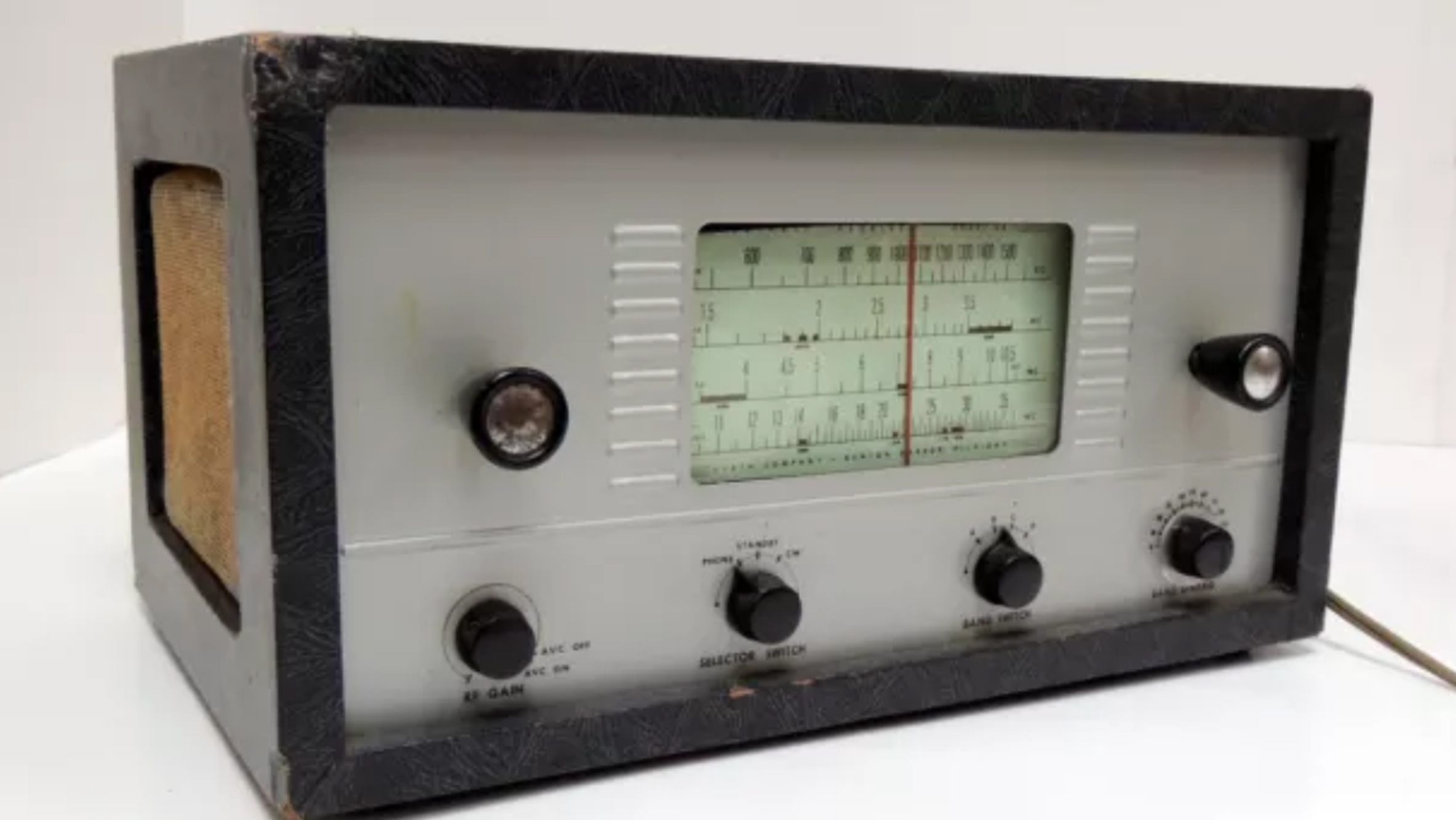 The AR-2 uses six tubes and its frequency coverage has been expanded, covering 535 kHz to 35 MHz in four bands. The IF is 455 kHz. Heath added a few amenities missing on the AR-1. These include a built-in speaker, a bandspread, BFO, RF gain control with AVC, a headphone jack and a noise limiter. Not included on the AR-2 were the AR-1’s tone control, phono/radio switch and pilot light. The dial is not illuminated.