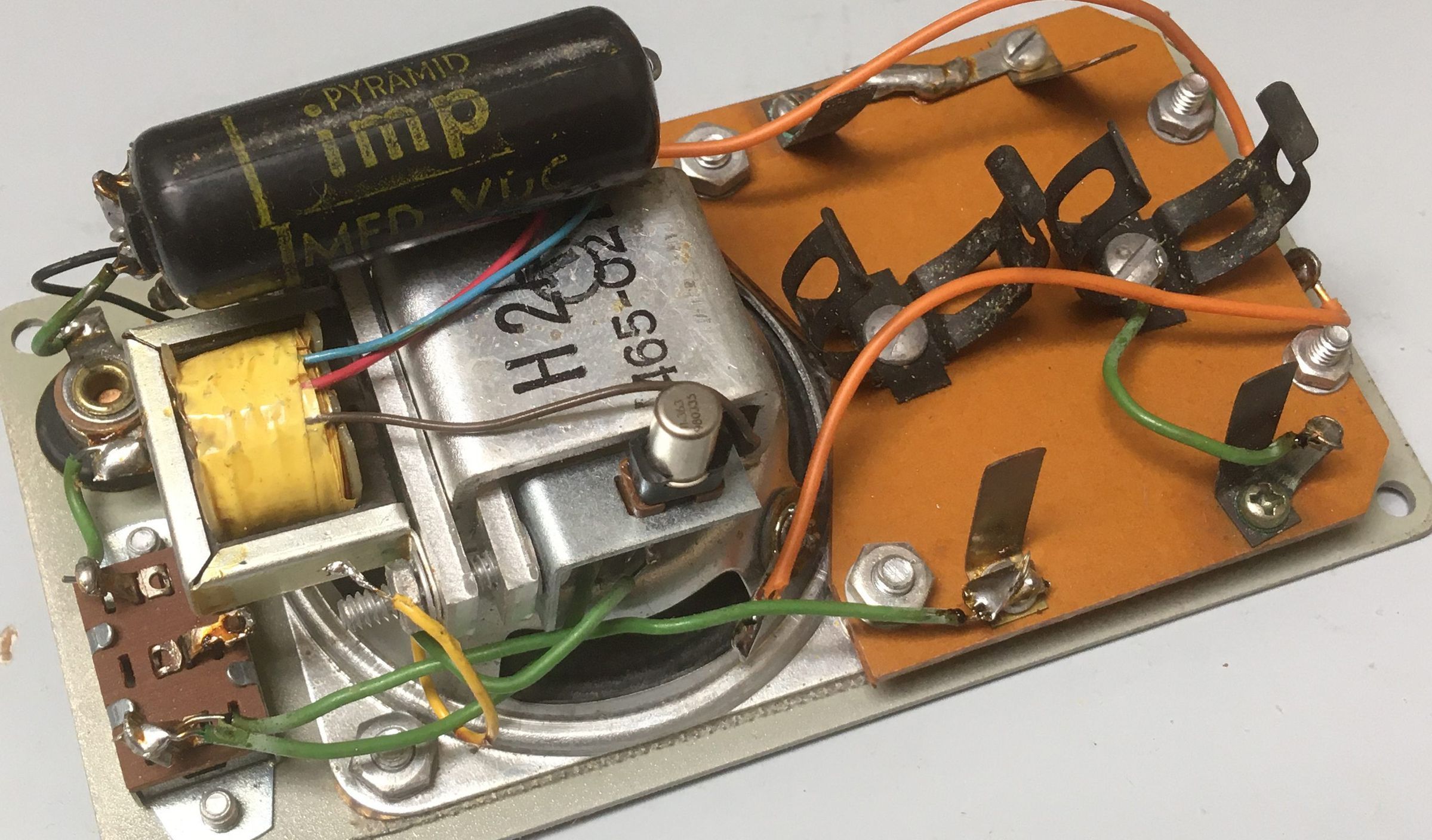 The CO-1 has a white front panel and a cloth grill over the speaker. It is powered by two “C” cells, was supplied with a key and features a switch-selectable tone or blinking light. The circuit uses a single 2N238 PNP germanium transistor.