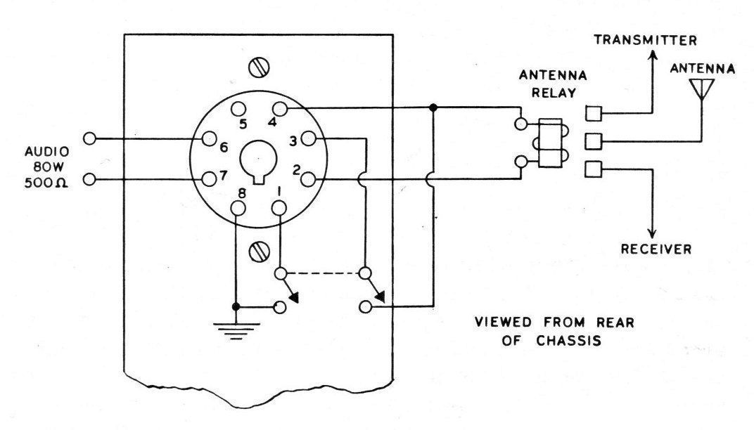 Refer to Figure 6. A rear panel octal socket is provided to duplicate the functions of the plate switch, and provides 120 VAC for an antenna relay and/or receiver mute relay when the plate switch is on. The socket is designed for use with the VX-1. In addition, audio output of up to 80 watts can be used for excitation of a higher power modulator, but this requires a modification of the DX-100(B). See the assembly manual for details (DX-100, page 57; DX-100B, page 59). Pin 8 provides and auxiliary ground in the event that shielded cable is used for remote operation.