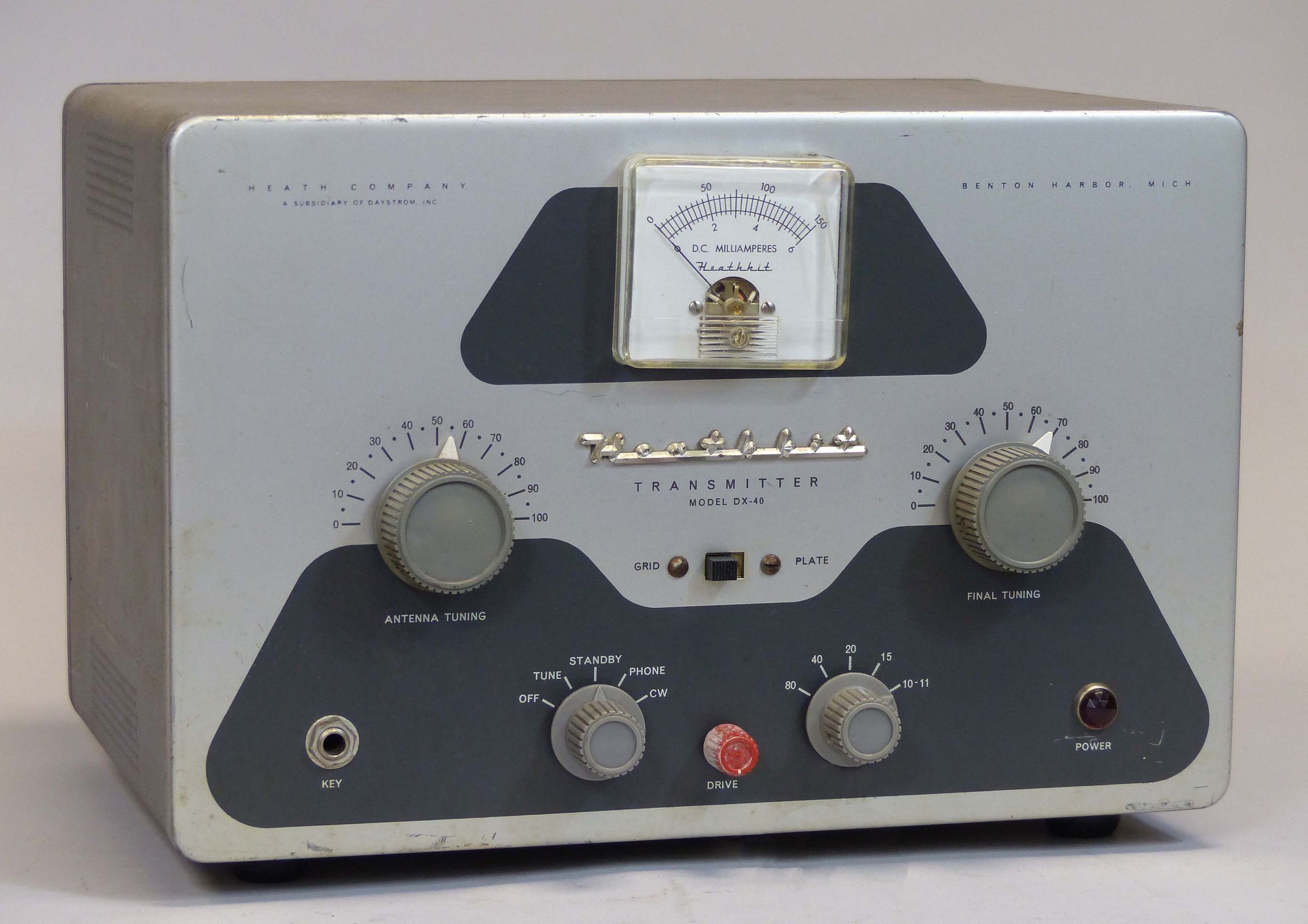 Particular attention should be paid to the knobs and the panel meter as these are often found to have been replaced with non-original parts. Also take care to note the presence and condition of the plastic Heath insignia under the meter, and that the meter has the Heathkit logo printed on the face. This silver colored insignia replaced the black version found on the DX-35.