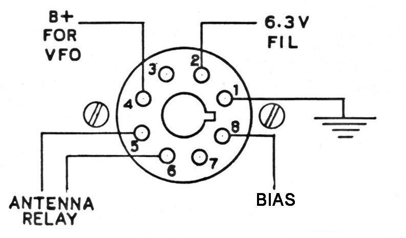 The accessory socket provides power for the HG-10(B) VFO, and for an external antenna relay. Pin 2 provides 6.3 volts at 4 amps on the DX-60 and 2 amps on the A and B versions. Pin 4 provides 300 volts B+ at 50 mA. Pin 8 provides –65 volts key up for grid-block keying of the HG-10(B) VFO.