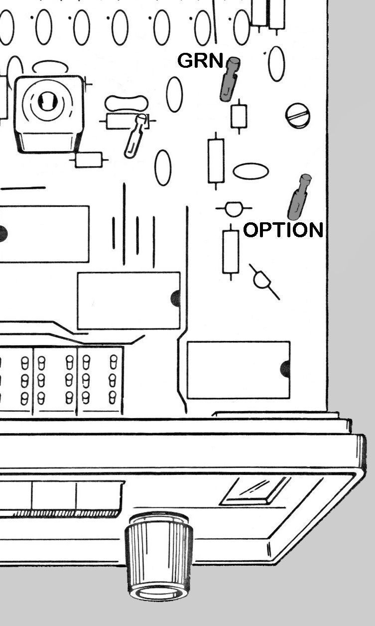 One of two modes of operation could be chosen during assembly. In one mode, the channel readout runs continuously. In the other mode, the channel indicator lights only when the squelch opens. The choice involves a green wire that comes from the underside of the chassis. Refer to photo for configuration options.