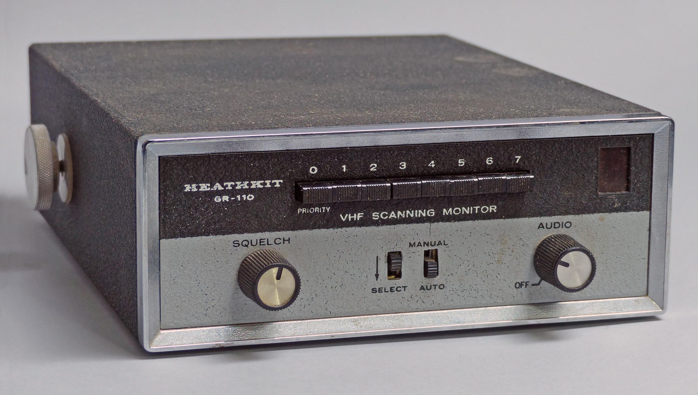 The GR-110 has a black and gray front panel with chrome trim and a wrinkle black case, though some may have been supplied with light green cases. Heath sold a ton of these scanners. They were popular for monitoring local repeaters and law enforcement, etc. In the end, the GR-110 proved too expensive and was replaced with a more conventional-looking scanner—the GR-1130 series.