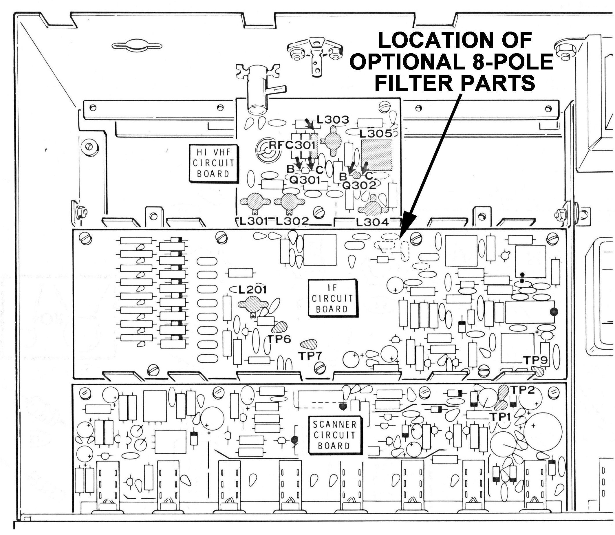 All versions have a rated sensitivity of better than .5 µV for 12 db SINAD, and all use a 10.7 MHz IF with a 4 pole crystal filter. An 8 pole filter was available as an option. Refer to photo for the location of the optional filter parts.
