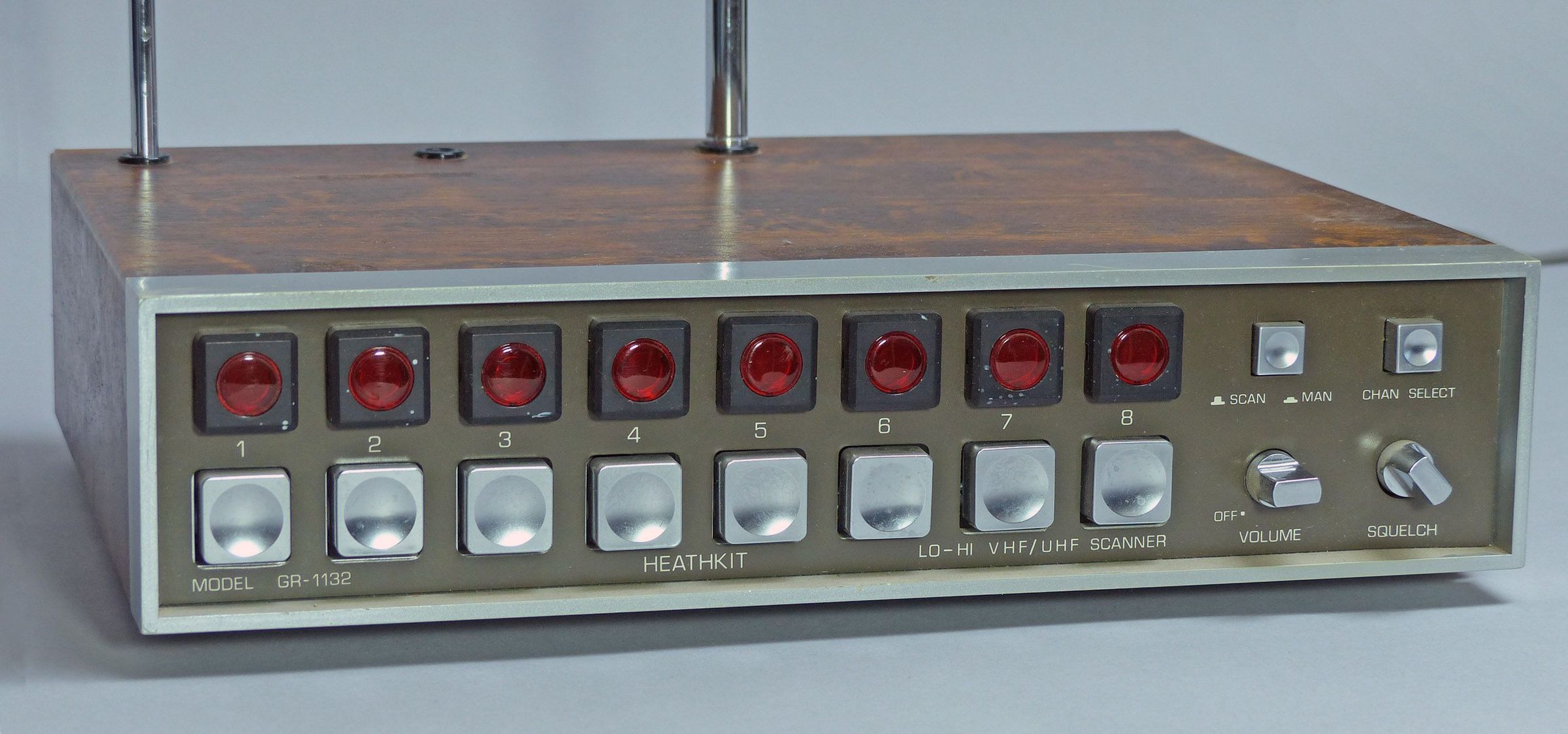 The GR-113X radios have brown wood-grain metal cabinets, and brown or gray front panels. The MR-1134 has a beige cabinet and a green front panel. Even though they worked OK, no one was real impressed with these scanners, and in the end, Heath eliminated them with big price reductions.