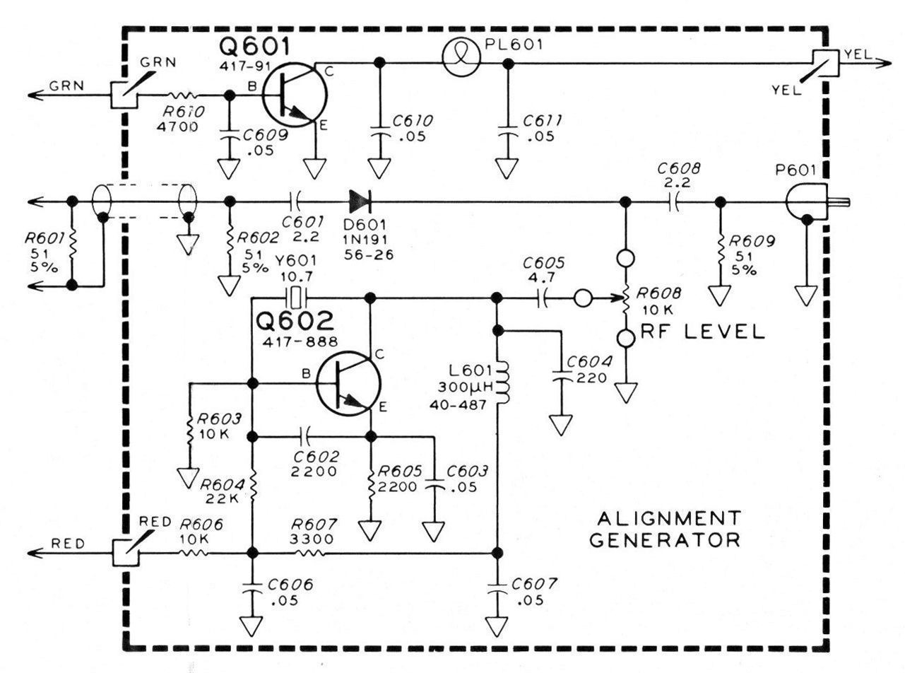 The kits were originally supplied with an alignment generator—a small circuit board assembled by the customer—with several wire leads, an integrated RCA plug, an RF level control and a small incandescent lamp. This generator takes power from the scanner to provided a 10.7 MHz signal used to align the IF board, and an on-channel signal used to align the RF stages. The lamp is used as a level indicator. Because these generators are virtually never found with the scanners today, the schematic in included here should the reader wish to construct one. Refer to photo.