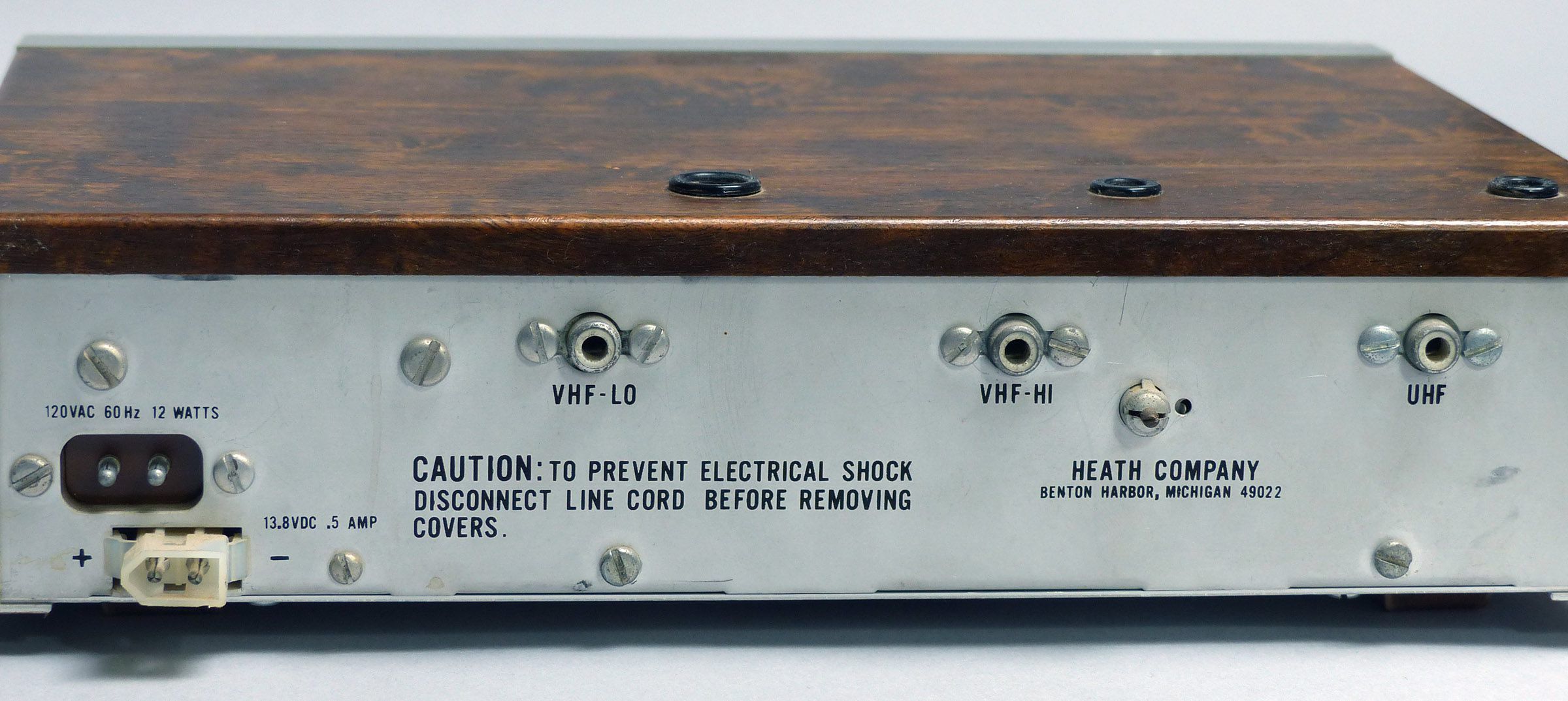 The GR-1132 has three separate built-in antennas while the other units have only one. All versions have external antenna jacks on rear panel and versions feature a built-in speaker but make no provision for external speaker. All use PC board construction and are designed for 120 VAC, 50/60 Hz, or 12 VDC operation and come with an AC cable. For DC operation Heath supplied only a plug—you had to make your own cable.
