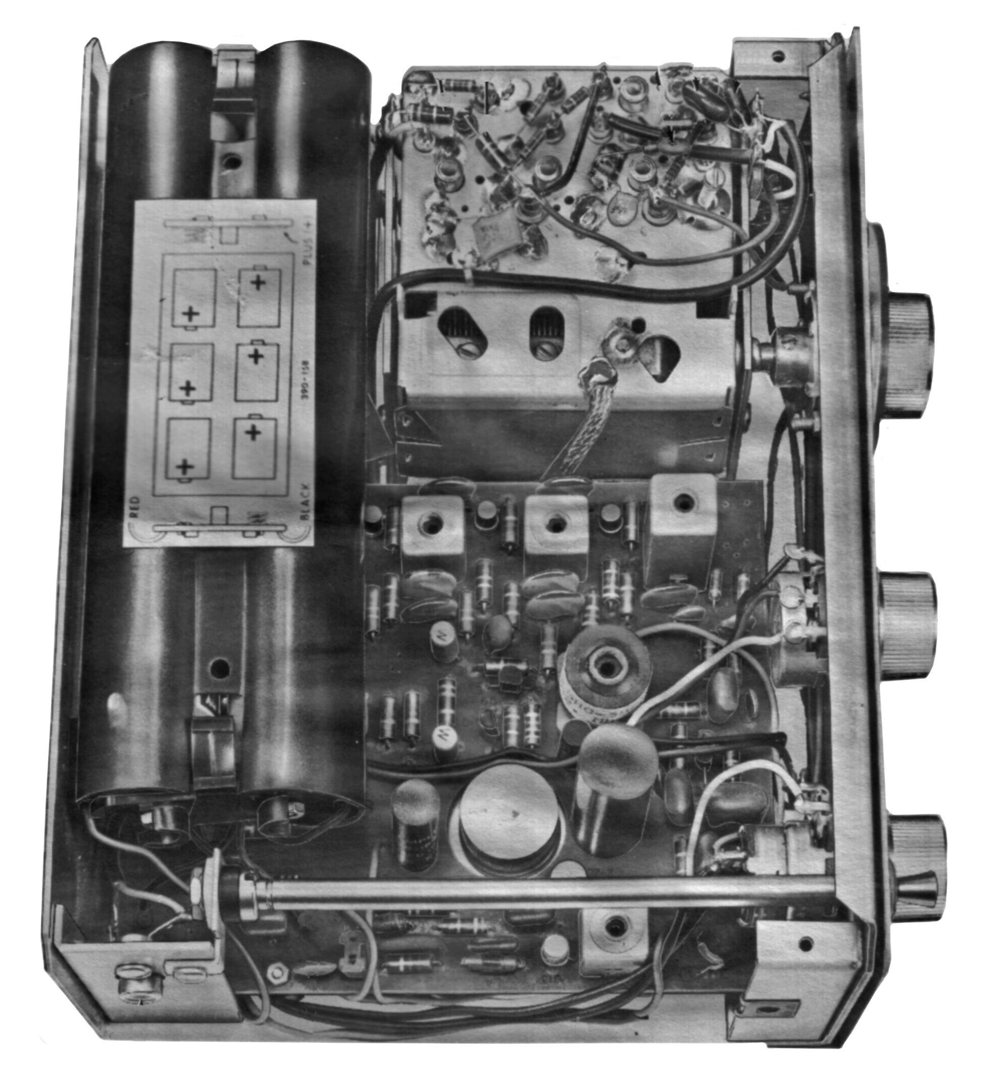 These 16 transistor portable VHF receivers work surprisingly well. They have reasonable sensitivity and are quite stable and drift free. The units feature a 6-to-1 vernier tuning drive ratio, squelch control, a VFO-XTAL switch with provisions for 1 crystal channel, and an internal telescoping antenna. The receivers have a built-in speaker and a jack for an external 50-75Ω antenna. The IF on both versions is 10.7 MHz. The sensitivity was advertised at 2.0 µV for the GR-88 and 1.5 µV for the GR-98.