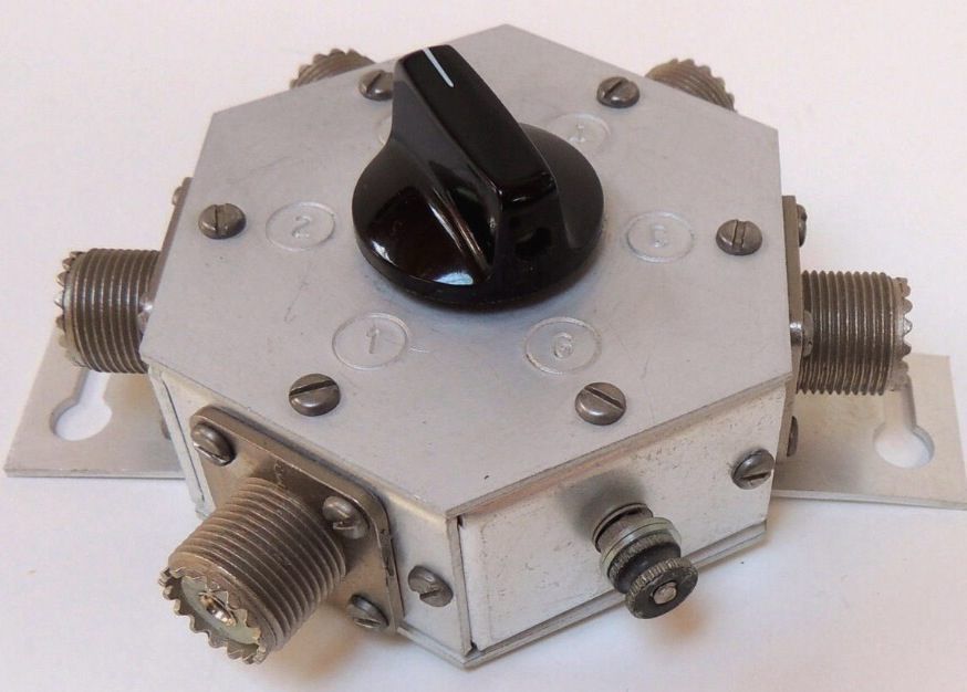 A pair of these switches can be connected together to permit any of four radios to be connected to any of four antennas or a dummy load. A grounding terminal post is provided.
