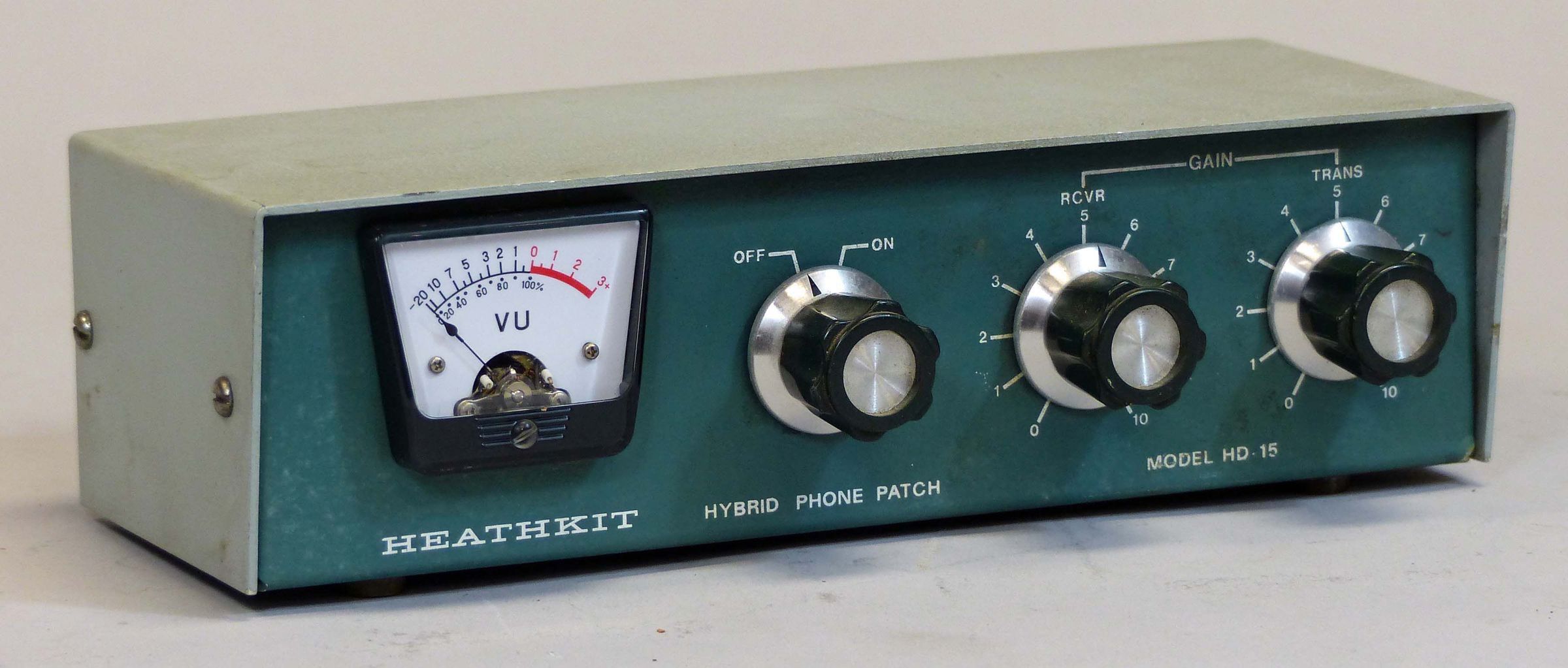 This is a just a restyling of the famous HD-19 phone patch and was done to bring the unit into line cosmetically with the SB series. Electronically the HD-19 and the HD-15 are virtually the same device. Other than the cabinet change to Heath’s “low boy” style, the most obvious change is that the station mic does not connect to the phone patch, as in the HD-19. Instead, the mic is connected to the transceiver in the normal way, and the patch connects to jacks provided on the back of the SB series transmitters and transceivers. The HD-15 is a simple device and works very well. There is very little to go wrong. It is easy to install, adjust, and use. The HD-15 was a very successful product and was on the market for 17 years. It was replaced by the HD-1515—becoming part of Heath’s “little brown box” series. Two-tone green wrinkle.