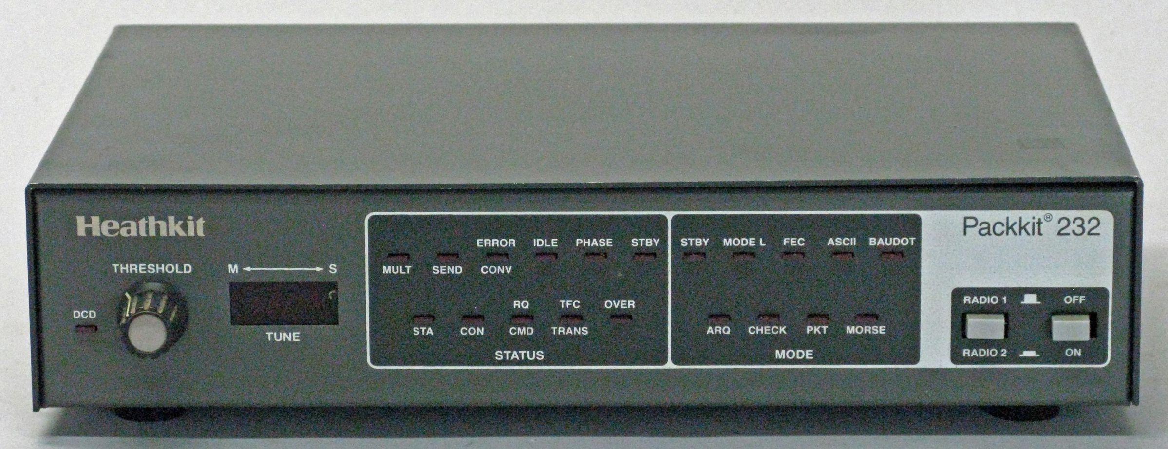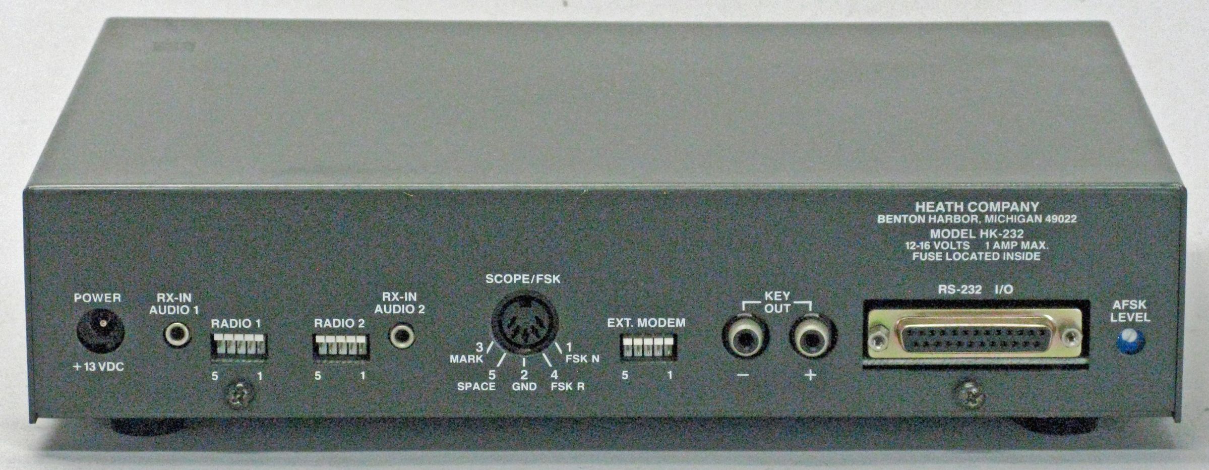 The HK-232 will send and receive Baudot and ASCII RTTY, black and white facsimile, AMTOR/SITOR, AX.25 packet, WEFAX and CW. It supports HF packet rates to 300 baud and VHF packet to 9600 baud, although rates beyond 1200 baud require an external modem. The TNC-to-computer baud rate can be as high as 9600 baud and the CW speed range is from 5-99 WPM. The HK-232 supports all common Baudot RTTY and ASCII rates. A special “SIGNAL” command causes the HK-232 to determine the mode being received and will preset the baud rate and mode. It also will invert the signal if required. A variety of front panel LEDs display the current operating mode and system status.