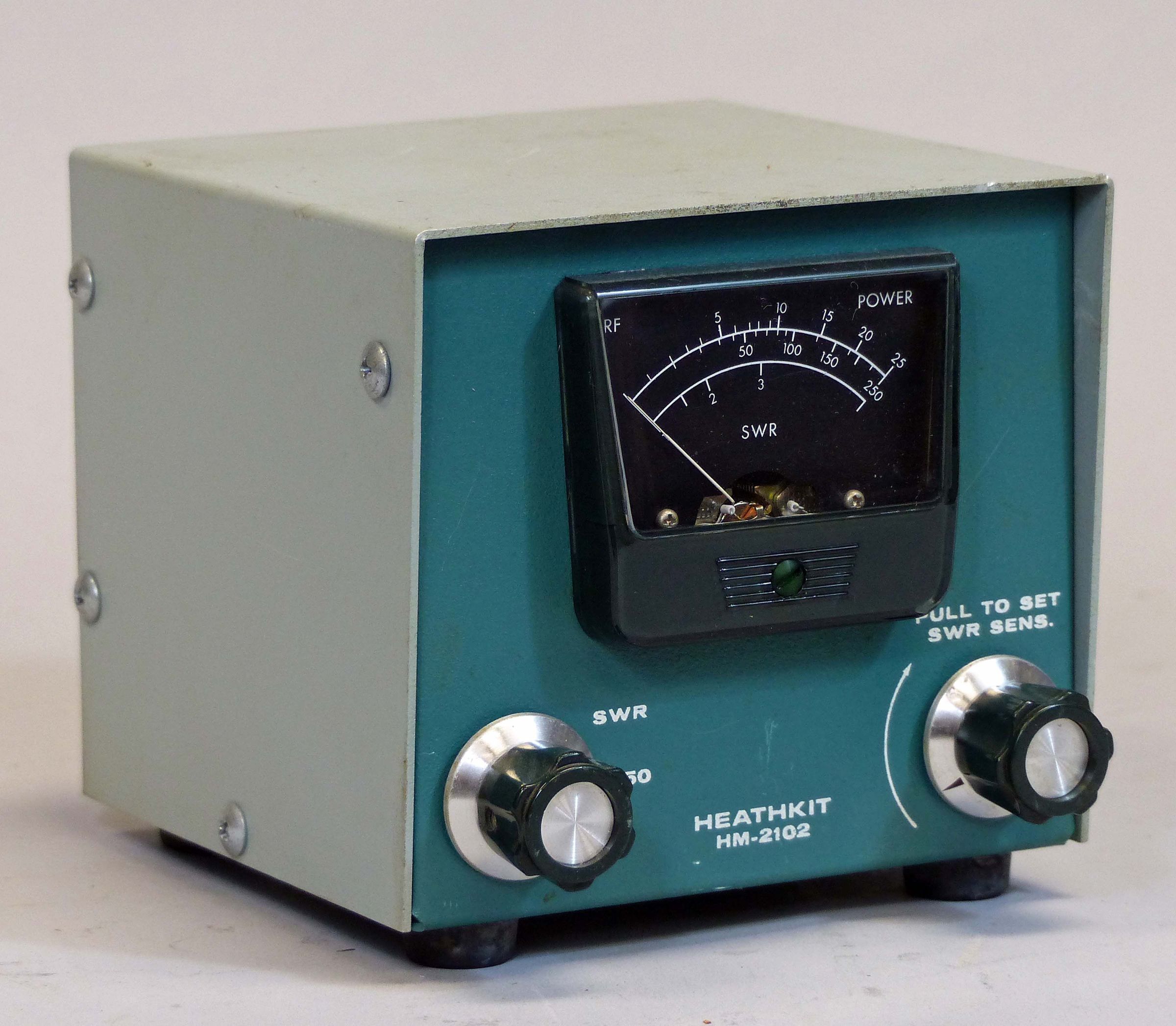 Other features include a removable sender unit that permits the meter to be placed up to six feet away. The 2102 may be placed in the line permanently with “little or no loss.” The unit is fitted with SO-239 connectors and has a light green cabinet with green wrinkle front panel. The HM-2102 is designed specifically for 50Ω systems, and will not function well with other impedances.