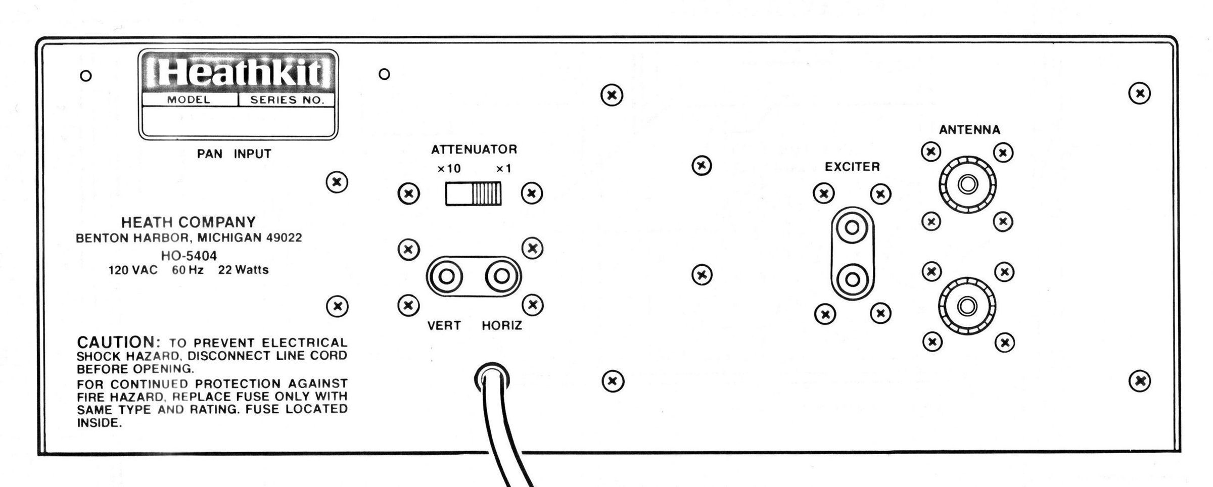 To check for the presence of the panadaptor module, look at the upper left corner of the HO-5404 rear panel. Refer to illustration. An RCA jack labeled “PAN INPUT” indicates the module is installed. Without the pan adapter module, the hole for this connector is covered by the blue and white Heathkit label. If there is any doubt, remove the cover and check for the presence of the circuit board. Refer to illustration for the location of the board.