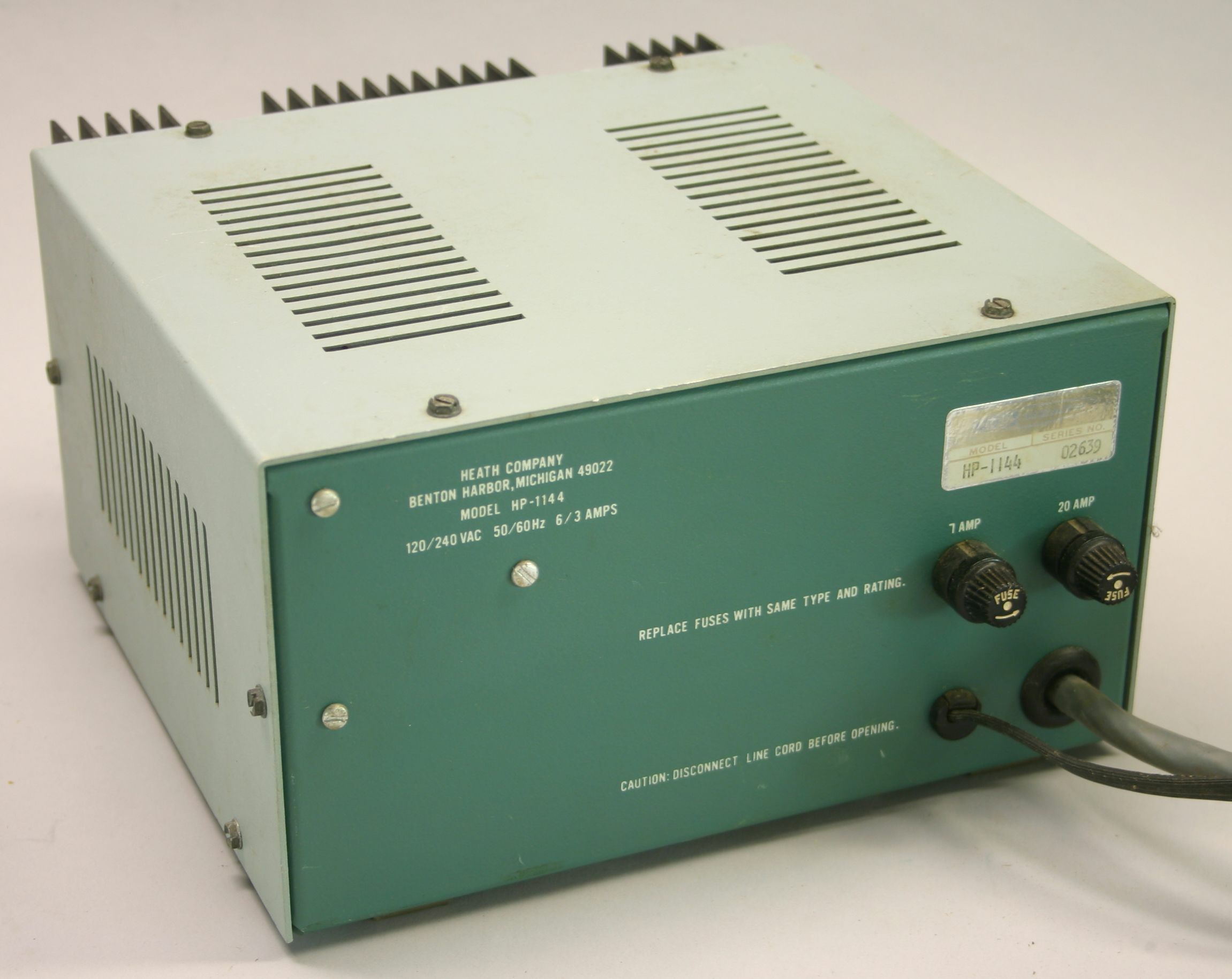 The HP-1144 and PS-1144 power supplies were designed for use with the SB-104 and HW-104, and were outwardly indistinguishable from each other. The blue and white label will identify the units. The basic specifications for both versions are identical, and both use a full-wave rectifier and “triple Darlington regulation."