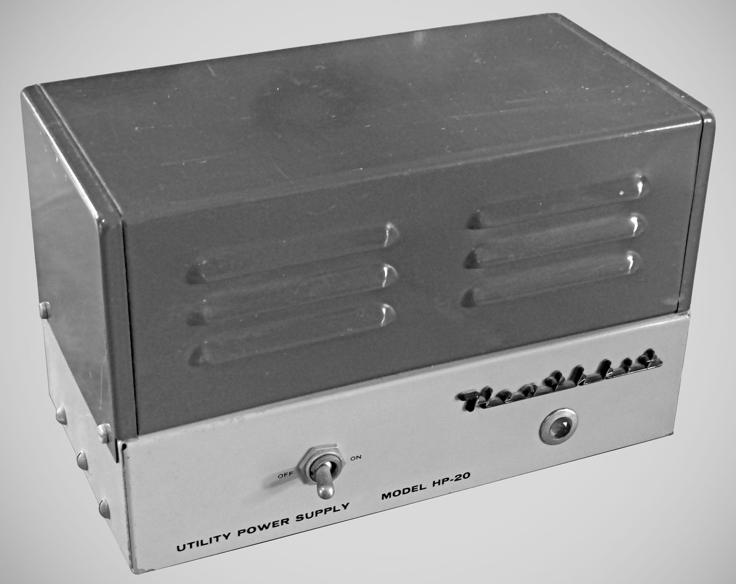 Examples of the HP-20 have been found with the 3D Heath script logo and the Heath/Daystrom screened logo. Units with the screened logo would be from later production runs. The front panel has an on/off switch and a pilot light. The rear panel has an octal socket for power out and the AC power cord. Housed in a louvered steel cabinet in two-tone Heath green.