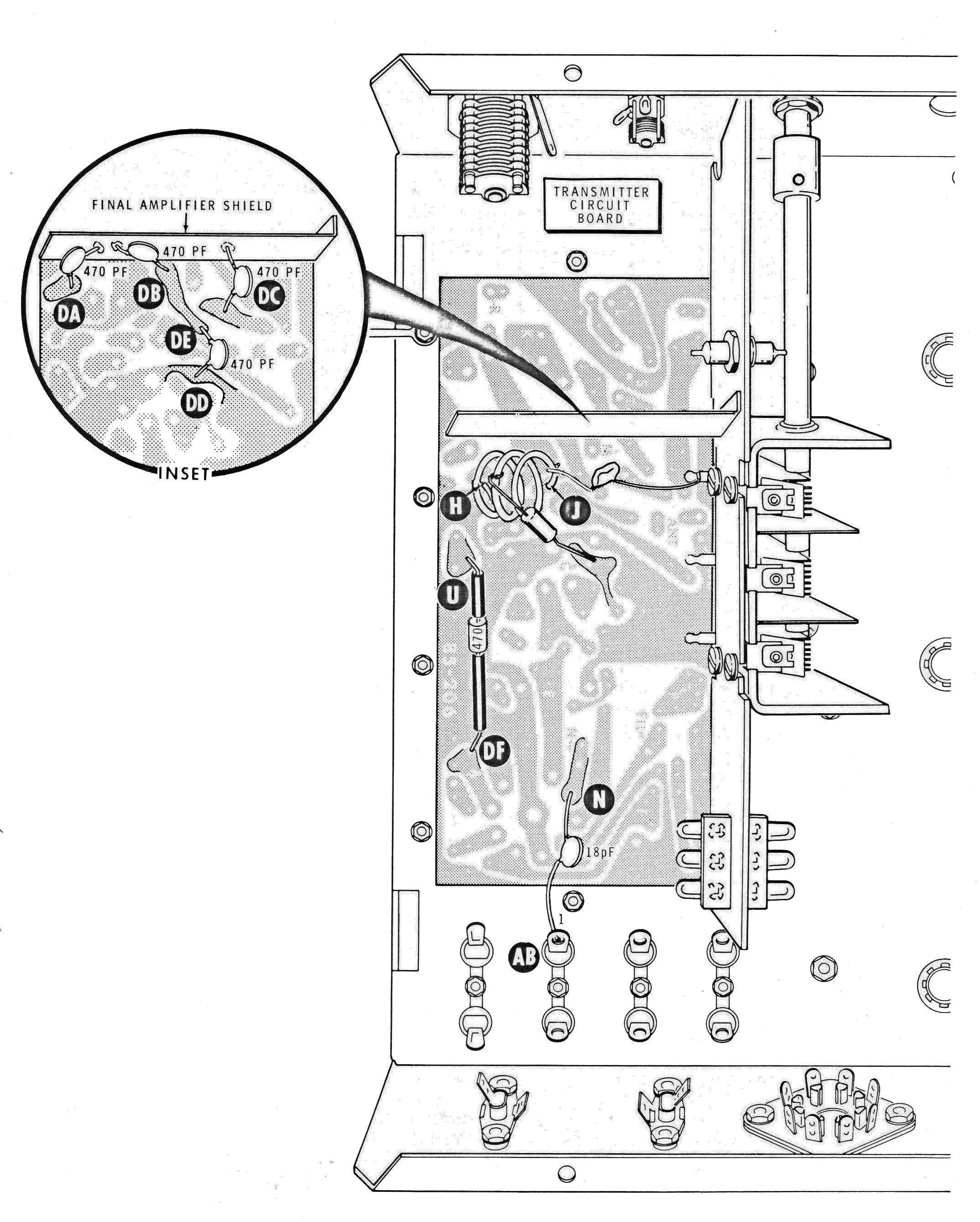 Refer to Pictorial A. Remove the HW-17 from its cabinet and look at the foil side of the transmitter circuit board. Check for the presence of added capacitors at DA, DB, DC, DD and DE as shown in the inset. Also check for an added capacitor between points AB and N.