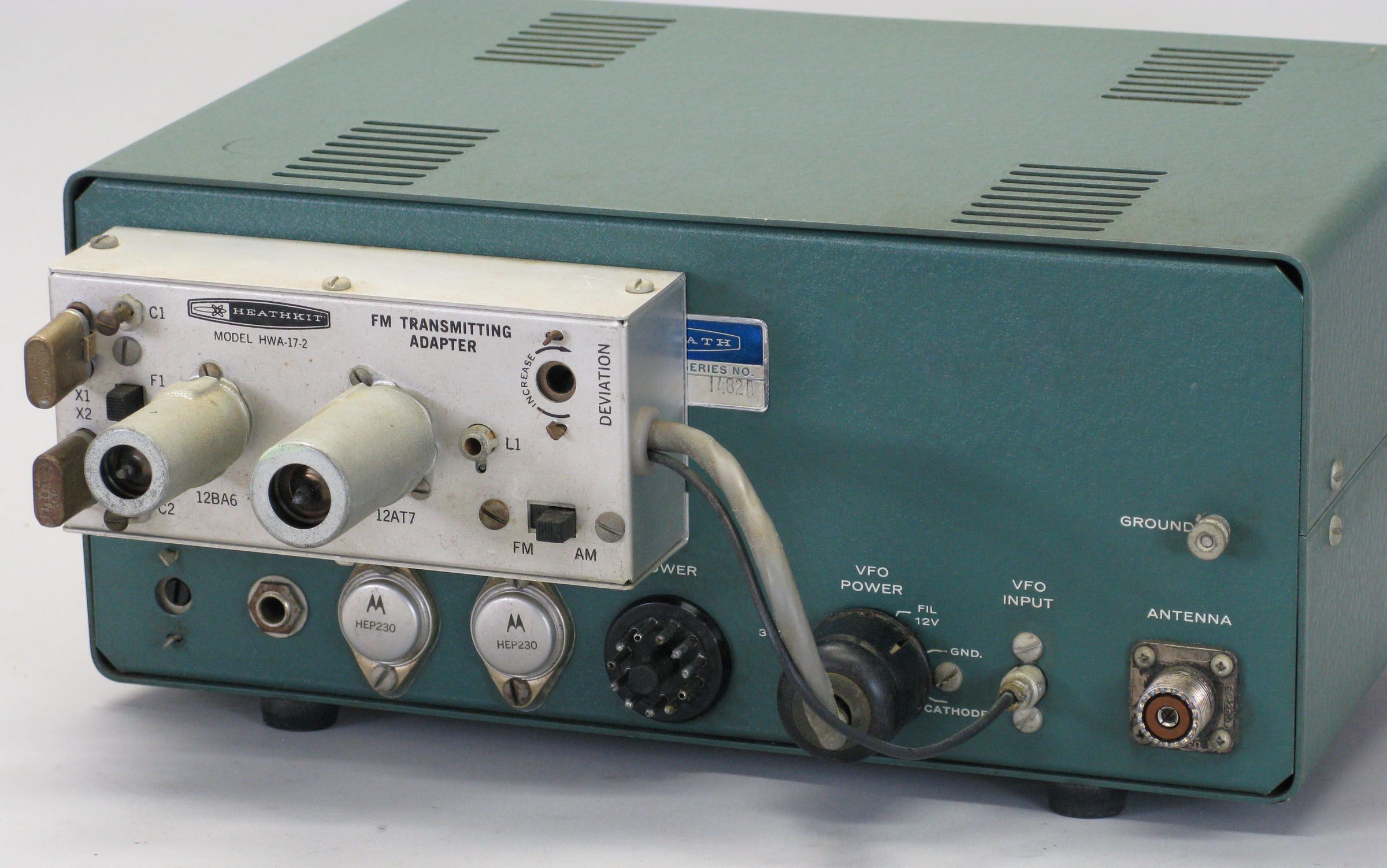 The only rear panel control is a meter zero adjustment. Rear panel connections include RCA jacks for a VFO and a 50-75Ω antenna, an 11-pin power socket for a VFO, octal power plug for power input, and a quarter inch headphone jack. The HW-17 was offered with an optional DC power supply (HWA-17-1) and an optional FM adapter (HWA-17-2)—a tube-type unit that mounted outboard on the rear panel.