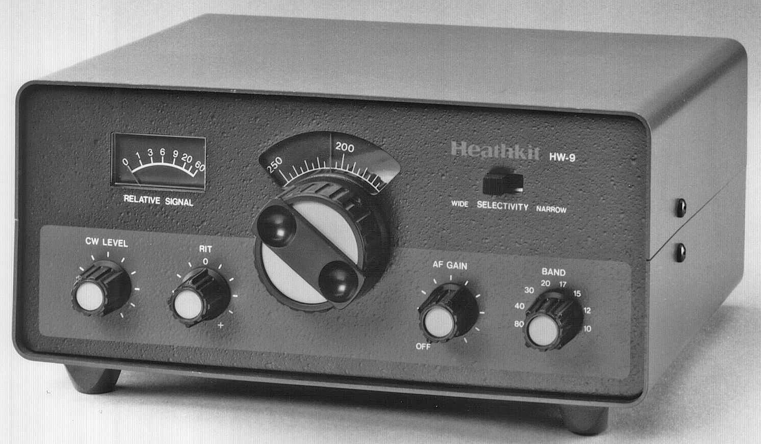 Receiver sensitivity is 0.2 µV. Selectivity is 1 kHz (wide setting) at 6 dB down and 250 Hz (narrow setting) at 6 dB down. Any problems with the HW-9 you may hear about will probably have to do with the VFO drive mechanics. There were reports of slippage and backlash and a general feeling that the whole dial assembly was too complicated and too small to work on.